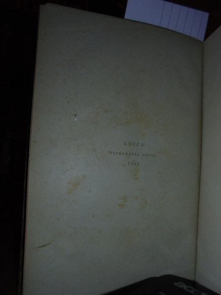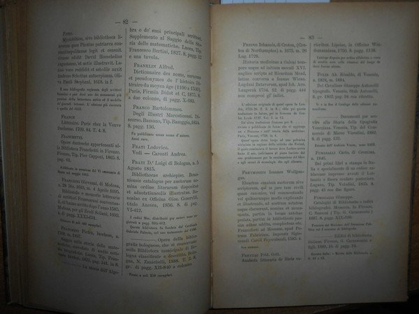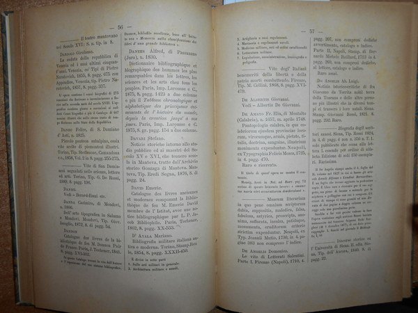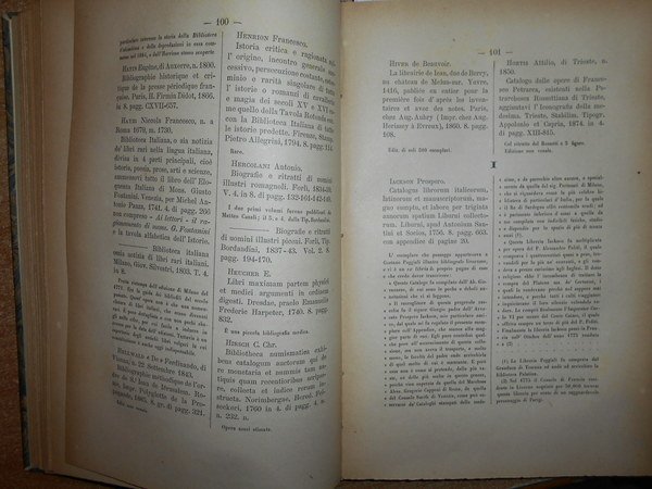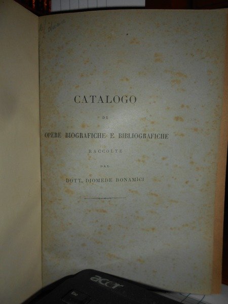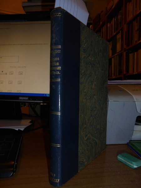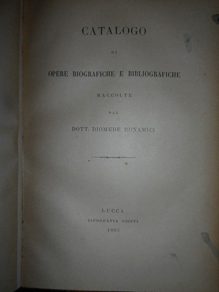 CATALOGO DI OPERE BIOGRAFICHE E BIBLIOGRAFICHE RACCOLTE da DIOMEDE BONAMICI. Lucca, Tipografia Giusti, 1893. In-8°, m. pelle con fregi e titoli in oro ai dorsi. (3), 228 pp. In ottimo stato di conservazione con le brossure originali conservate. Neg. lett. mod. mob. H