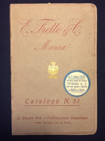Br. ed. con titoli rossi e stemma sabaudo dorato, pecetta circolare di aumento prezzi applicata, angoli dei piatti smussati, cm 15x22.5, pp 226 + 4 carte colorate (2 di modulo d'ordine e 2 di annessi in fine) e un foglietto di aumento dei prezzi per il 1920 applicato a pagina 3; moltissime illustrazioni al tratto.