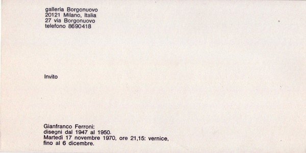 *Catalogo Gianfranco Ferroni. Galleria Borgonuovo Milano. 17 novembre, 6 dicembre 1970. Allegato invito alla mostra.