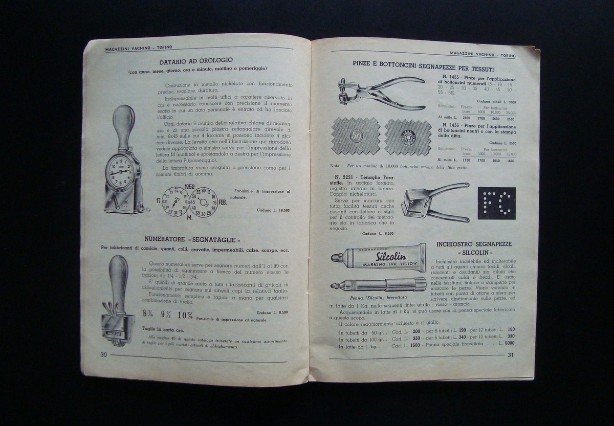 Catalogo, MAGAZZINI VAGNINO CATALOGO Speciale di articoli vari per l'ufficio per il commercio e per l'industria Tip. Artale, Torino, 195, cm 24x16,5; pp. 128; br.ed.con molte ill.fot. b/n in t. Condizioni di conservazione. Esemplare in buone condizioni con leggere tracce d'uso e del tempo, margine sup. della br.ant leggermente ondulato per traccia di vecchia umidità, angolo con piega e piccolo strappetto, cuffie del dorso con piccolissime abrasioni e minuscoli taglietti, br, post. con piccole macchiette, interni leggermente bruniti ma buoni. OPEB.4067 blu