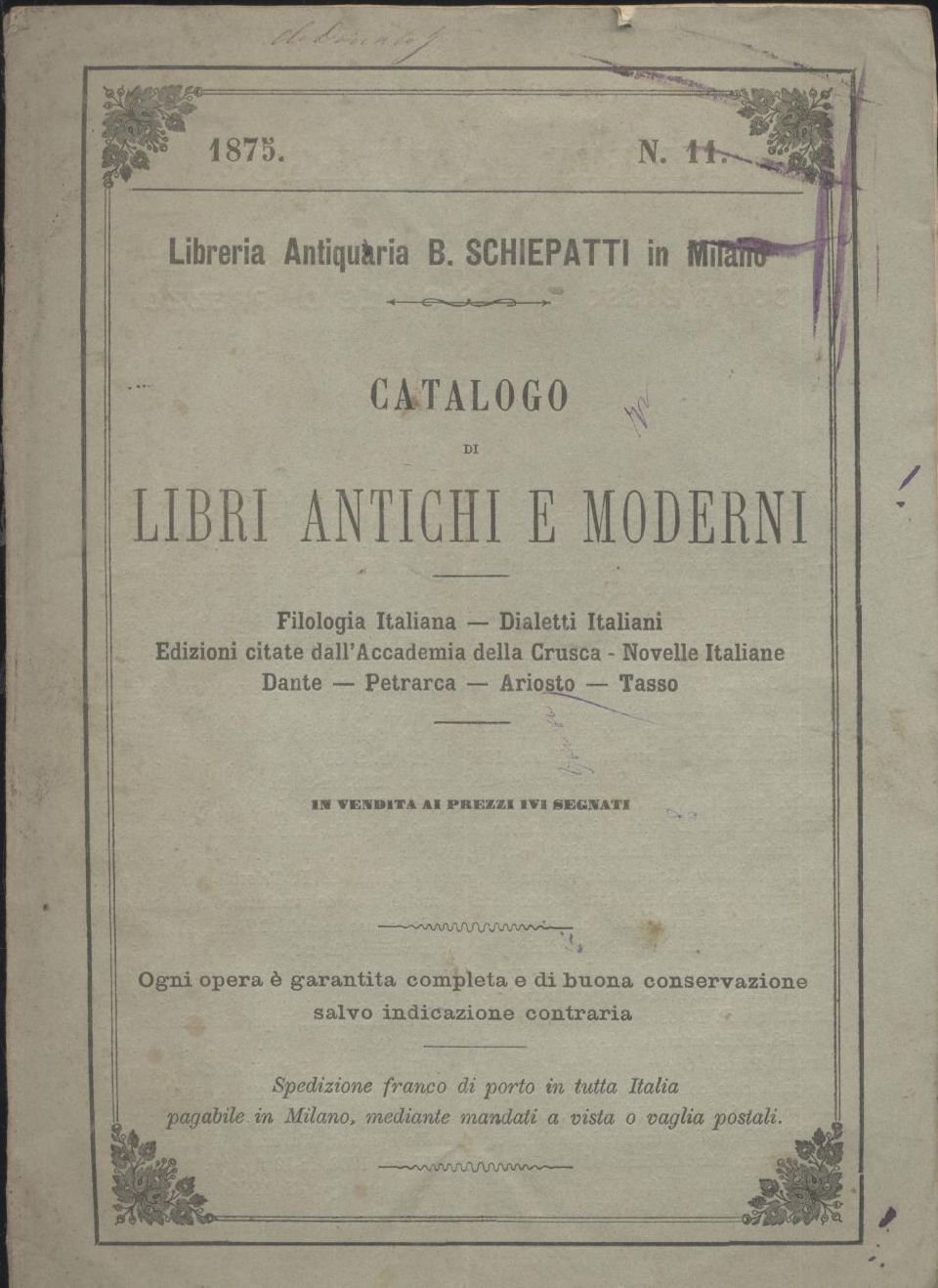Interessante catalogo di libri antichi della libreria B Schiepatti di Milano n. 11 del 1875.