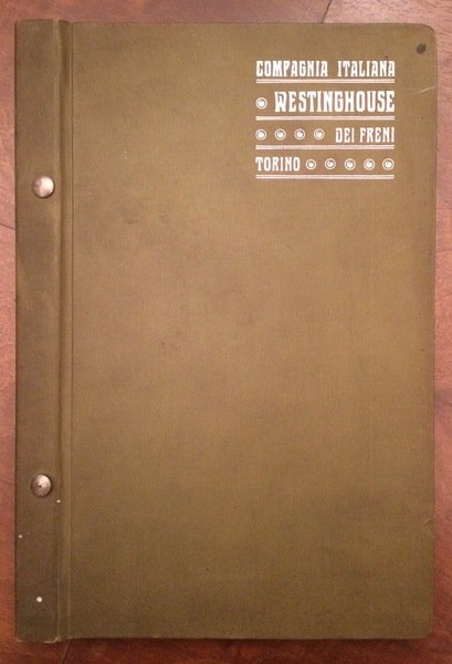 Cartella editoriale in tela verde con titoli argentati sul piatto anteriore e dorso, e logo aziendale sul piatto posteriore, e due rivetti metallici che fermano i fascicoli attraverso fori sul margine come un quaderno ad anelli; misura cm18.5x26.5. Il catalogo si compone di 11 fascicoli, ciascuno con proprio titolo (in rosso) e numerazione propria, e illustrato da tavole e figure; i primi otto fascicoli hanno le tavole in numerazione continua (complessivamente 63, con disegni tecnici e diagrammi), gli ultimi 3 hanno figure nel testo. Fascicolo 1°: Freni Westinghouse per Ferrovie leggiere o Tramvie, pp 4 (6); di fatto un fascicolo introduttivo, illustrato con 8 immagini degli stabilimenti nel testo. Fascicolo 2°: Apparecchi per Freni ad Aria Compressa e Schermi di Impianto, pp 21 (3). Fascicolo 3°: Rubinetti di Comando e Valvole Spandisabbia, pp 12; Fascicolo 4°: Cilindri del Freno e Registratore Automatico dei Ceppi, pp 7 (1). Fascicolo 5°: Triple Valvole, pp 3 (1). Fascicolo 6°: Compressori d'Aria ed Impianti per Compressione d'Aria, pp 15 (1). Fascicolo 7°: Regolatori di Pressione per Compressori d'Aria, pp 20. Fascicolo 8°: Accessori, pp 15 (1). Fascicolo 9°: Compressori Elettrici a Corrente Continua Tipo National, pp 18 (2), 16 figure in nero nt. Fascicolo 10°: Regolatore Pneumatico ad Olio Tipo National N, pp 12, alcune ill. in nero nt. Fascicolo 11°: Compressori d'Aria Portatili a Motore Elettrico, pp 18 (2), 14 ill. in nero nt.
