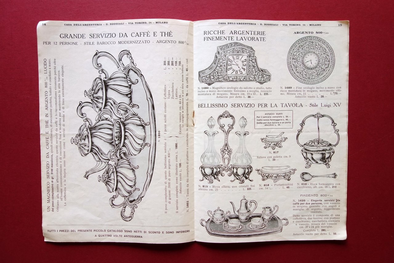 Catalogo, Premiata casa dell'argenteria G. Boggiali casa fondata nel 1898 via Torino 34 - Milano argenteria e posateria di nostra produzione listino trimestrale numero 32 - marzo 1932 Milano 1932; cm 23x16; pp. 28 con numerose ill. in b/n; copertina ill. a colori. Fogli uniti al dorso mediante spillatura editoriale. Condizioni di conservazione Buone condizioni con tracce d'uso, leggerissima traccia di piega centrale, brossura anteriore con minuscole pieghette agli angoli e con qualche piccola leggerissima ombra di gora le quali non interessano le pagine. Interni buoni. SC03.D18283 N