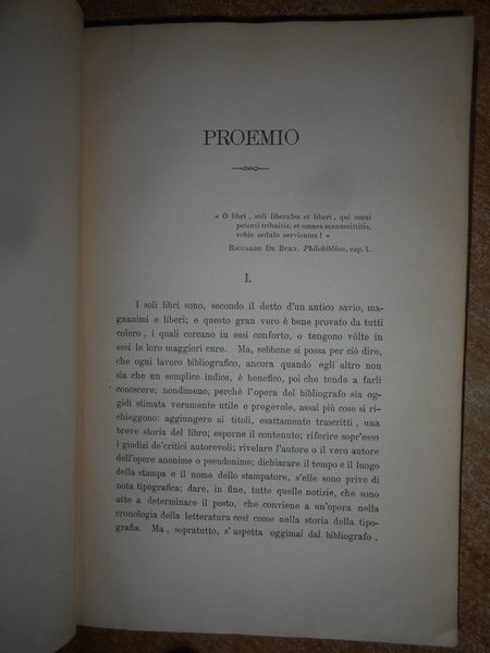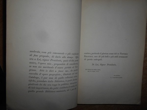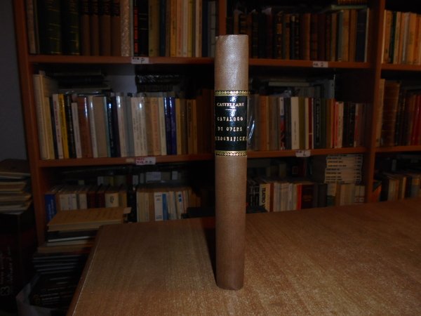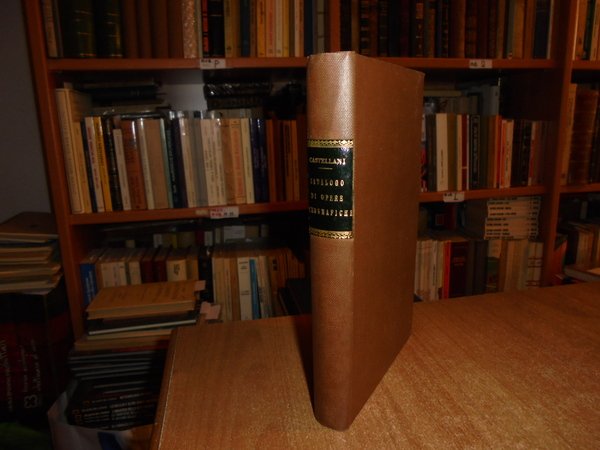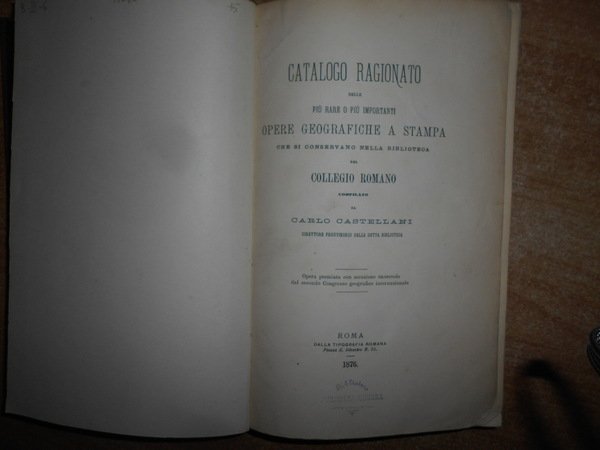 CASTELLANI, CARLO. Roma, dalla Tipografia Romana, 1876. CATALOGO RAGIONATO delle più rare o più importanti OPERE GEOGRAFICHE A STAMPA che si conservano nella Biblioteca del COLLEGIO ROMANO. In-8°, tela con titolo in oro entro tassello al dorso. xvi, 295, (1) pp. Ottimo esemplare in edizione originale. Uff. B - III - 6