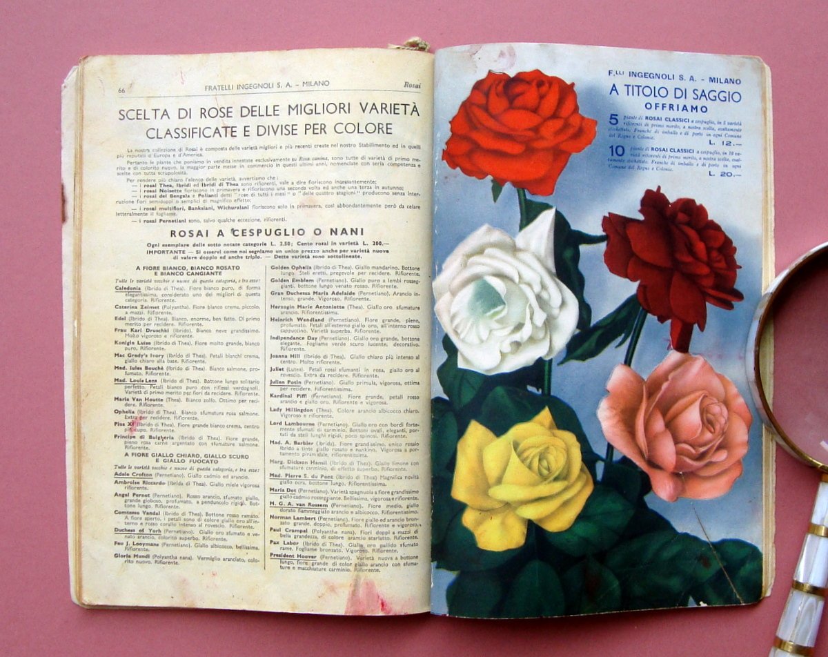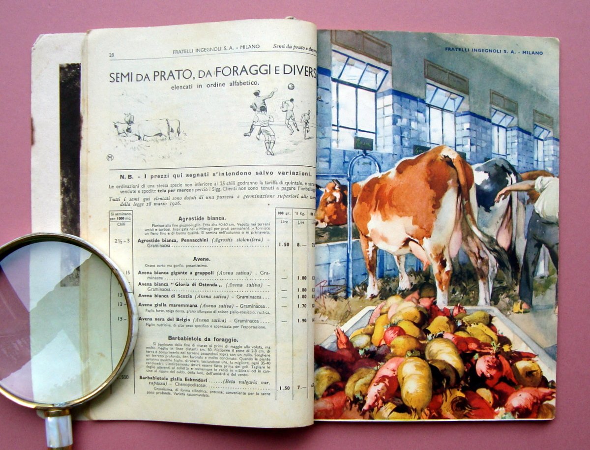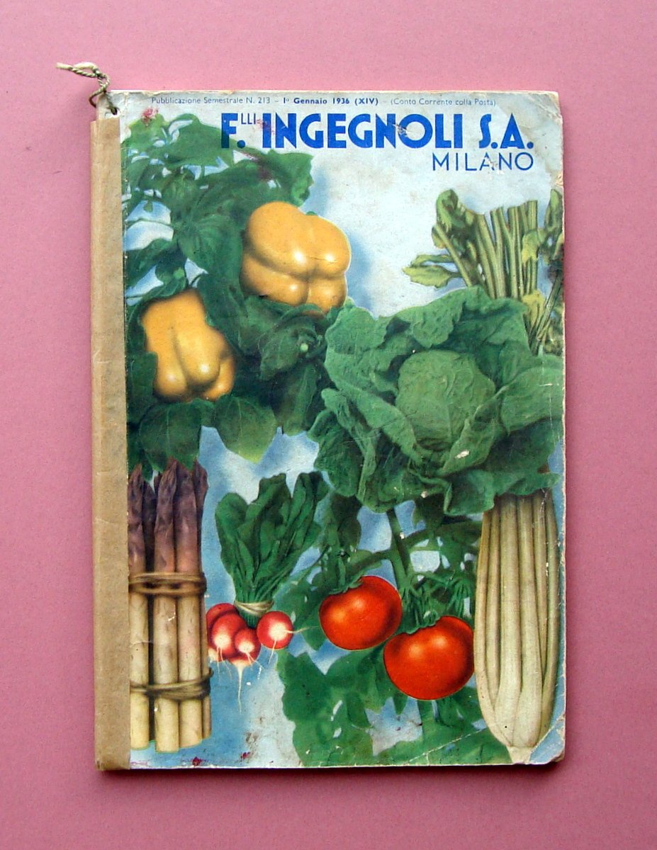 Catalogo, F.lli Ingegnoli S.A Milano Sementi per ortaggi-fiori-foraggi-cereali-bulbi da fiore-piante-attrezzi-concimi-insetticidi Catalogo Generale primavera 1936 Pubblicazione Semestrale N. 213 1 Gennaio 1936 (XIV) Stampa Barabino Graeve, Genova, 1936; cm 23,5x 16, pp 82; br. ed. ill a colori con molte ill in b/n e a colori f.t. Angolo superiore sinistro con forellino e vecchia cordella per fissaggio. Condizioni di conservazione Esemplare in buone condizioni con tracce d'uso e del tempo, br. con pieghette agli angoli e piccoli strappetti ai margini, il dorso presenta vecchio restaurato con braghetta (esempl.compatto); pag. 68 con traccia di precedente restauro con nastro adesivo(vedi foto); interni con leggere bruniture e qualche piccola macchietta. OPEB.5432 blu