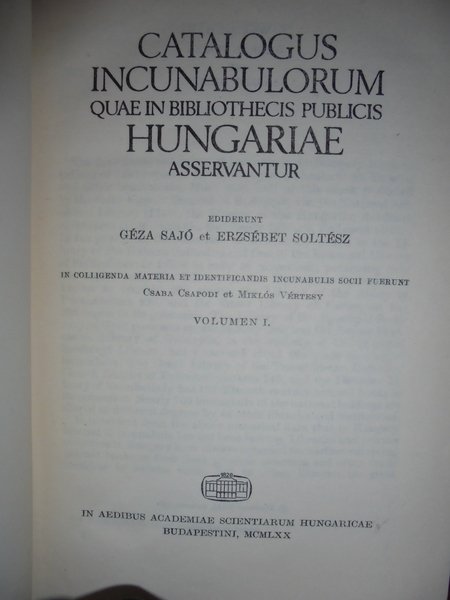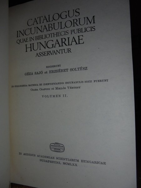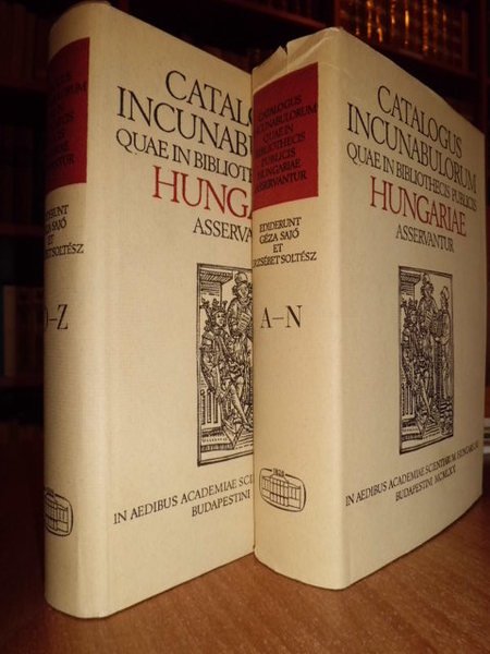 Géza,Sajo et Erzsébet,Soltész. In colligenda materia et identificandis incunabolis socii fuerunt Csba Cspodi et Miklòs Vértesy. In aedibus Academiae Scientiarum Hungaricae, Budapestini, MCMLXX. 1st Edition. 2 volumi in - 8°, tela con titoli sul dorso e sui piani e sovracopertine. Volume 1 : A - N and Vol 2 0 - Z (1440 pages + 78 pages of plates. From the flyleaf written in English: " Libraries in Hungary keep about 7000 incunabula in major part unknown to foreign reserachers. The Catalogue, edited in Latin language and supplemented with a comprehensive introduction in English, is the first complete register of the incunabula of international value kept in fifty seven libraries in Hungary. Several unique or very rare pieces from the 15th century are first listed here. Part 1 is a bibliographic description of the incunabula in the authors' alphabetical order, with the location of the copies. Completeness or defectiveness of the copies as well as call - numbers of the represective libraries are dully marked. In Part II the incunabulae listed by countries, places and presses. An alphabetical index of the non - latin printings the concordances relative to the most important incunabula bibliographies and a register of printers, translators and editors make the Cataligue a standard work of reference on iuncunabula in Hungary. A concise introduction , in English, discloses all information on incunabula and collections in Hungary." Volumi come nuovi. Neg. lett. mod. mob. C