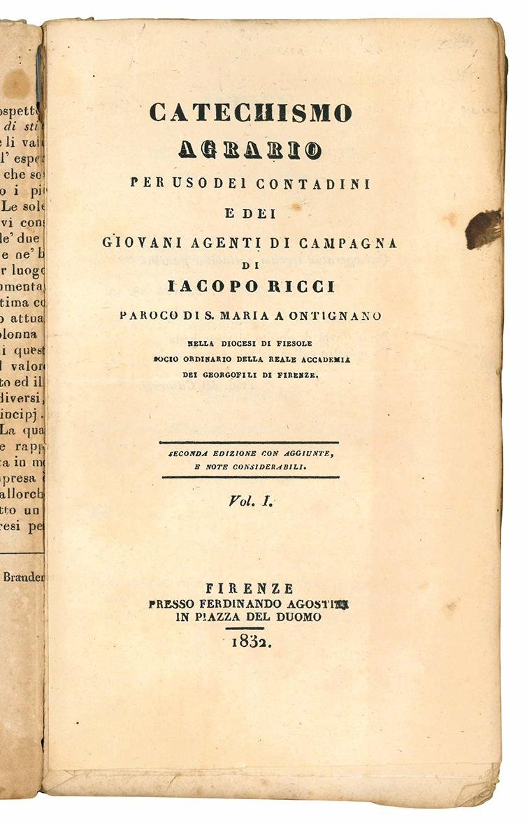 Catechismo agrario per uso dei contadini, e dei giovani agenti di campagna di Jacopo Ricci. Edizione seconda con aggiunte, e note considerabili. Vol. I (-II).