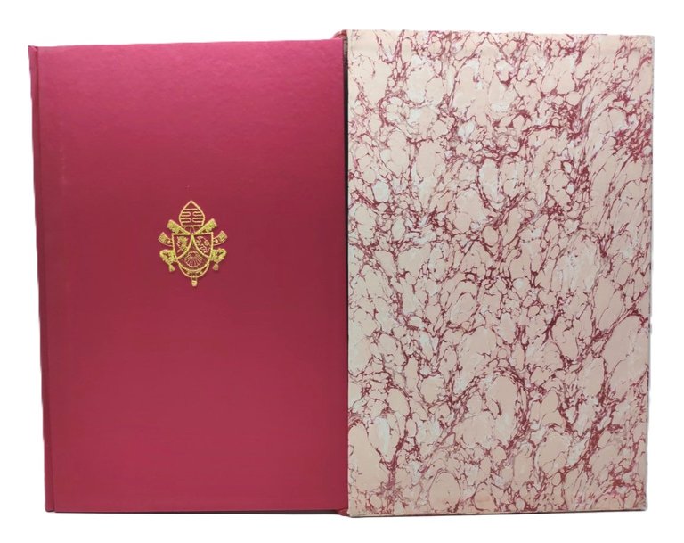 cofanetto editoriale rivestito in carta marmorizzata in buono stato, lievissimi segni del tempo, legatura rigida in seta Orient porpora con stampa in oro a caldo e ricamo con stemma papale in Filo d'Oro Titoli al dorso leggermente sbiaditi Esemplare numero 2051 su 2950 dimensioni cm 44,3 * 30 * 7