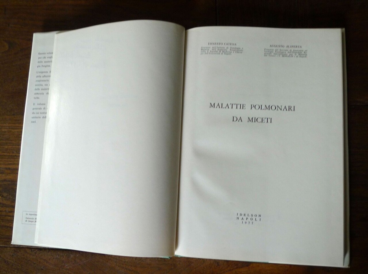 Ernesto Catena, Augusto Aliperta,MALATTIE POLMONARI DA MICETI.Casa Editrice Idelson di F. Gnocchi, Napoli 1977,copertina rigida, rilegatura in tela,sovraccoperta illustrata, 25x18 cm., pp.162,illustrazioni in bianco e nero,peso: g.600