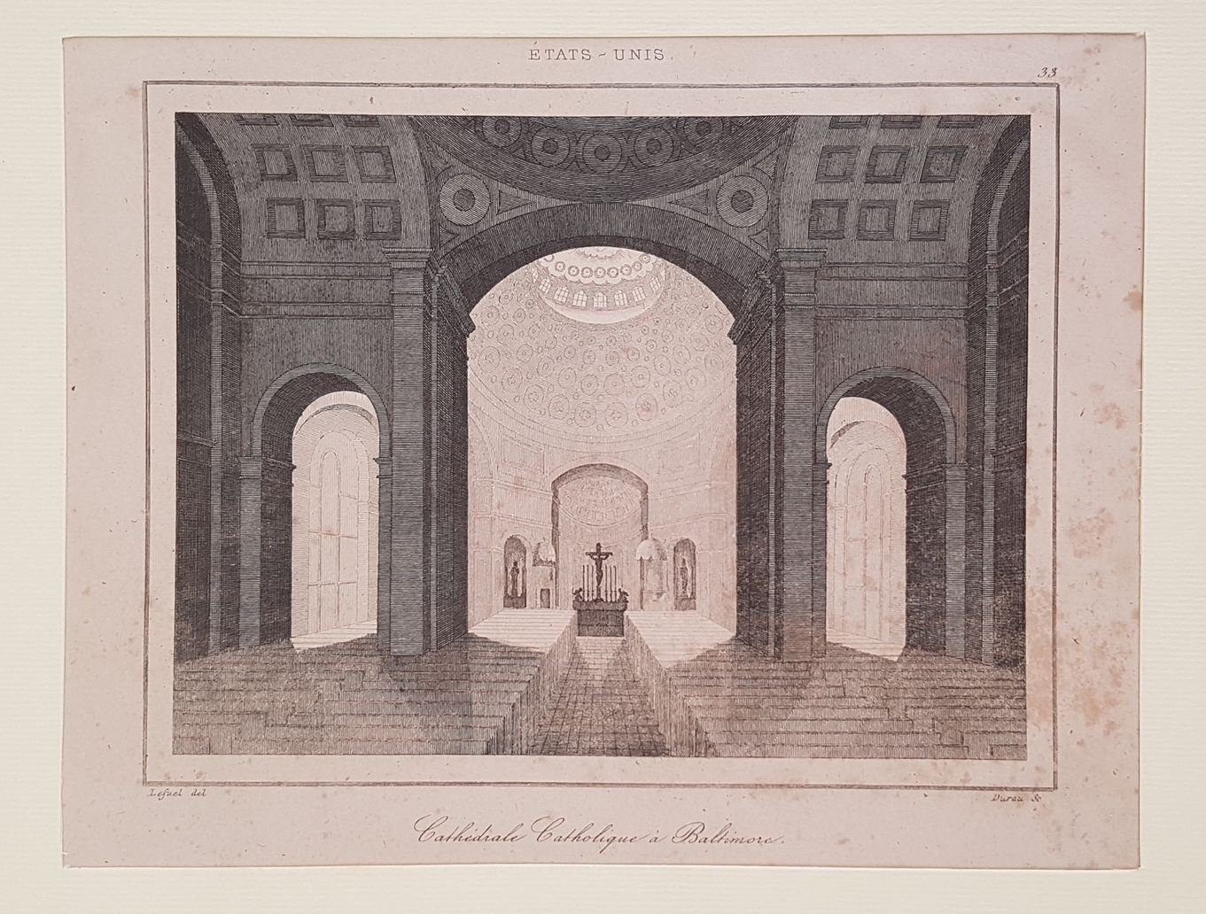 Veduta della Cattedrale di Baltimore del 1838 circa montata su passepartout. Data: 1838 circa Tecnica: acquaforte Autore: Durau su soggetto di Lefuel Dimensione del passepartout: 25x17,5 cm Dimensione incisione: 14,5x11,5 cm Condizioni: Buone. Rare fioriture.View of Cathedral of Baltimore of 1838 circa mounted on passepartout. Author: Durau after Lefuel Date: 1838 circa Technique: Steel etching Leaf Dimension: 25x17,5cm (8.3x4.9 inches) Engraving Dimension: 14,5x11,5 cm (5.5x4.3 inches) Conditions: Good conditions. Some foxings and water stains.