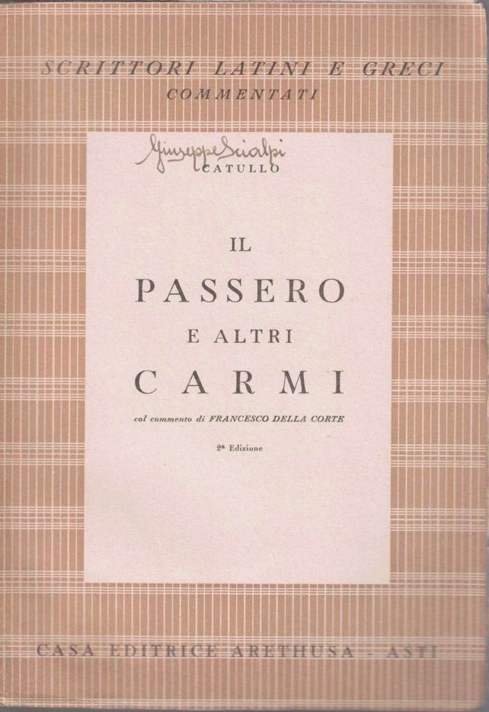 Gaio Valerio Catullo, (Gaius Valerius Catullus), Il passero e altri carmi, col commento di Francesco Della Corte, Casa Editrice Arethusa, Asti 1946, seconda ed., pp. 167, cm 20, br. ed. Collana Scrittori latini e greci commentati. Testo in lingua latina con introduzione e commento in lingua italiana. Firma d’appartenenza a prima di copertina, prima carta di guardia e frontespizio. Sigla d’appartenenza al verso del frontespizio. Lievissima ombra di gora appena percepibile al margine inferiore di copertina posteriore e ultime carte di testo, qualche sporadico segnetto di lapis, minime fioriture ai tagli, per il resto e nel complesso più che buona copia, con interno pulito, ben tenuto e di piena fruibilità e brossura solida.
