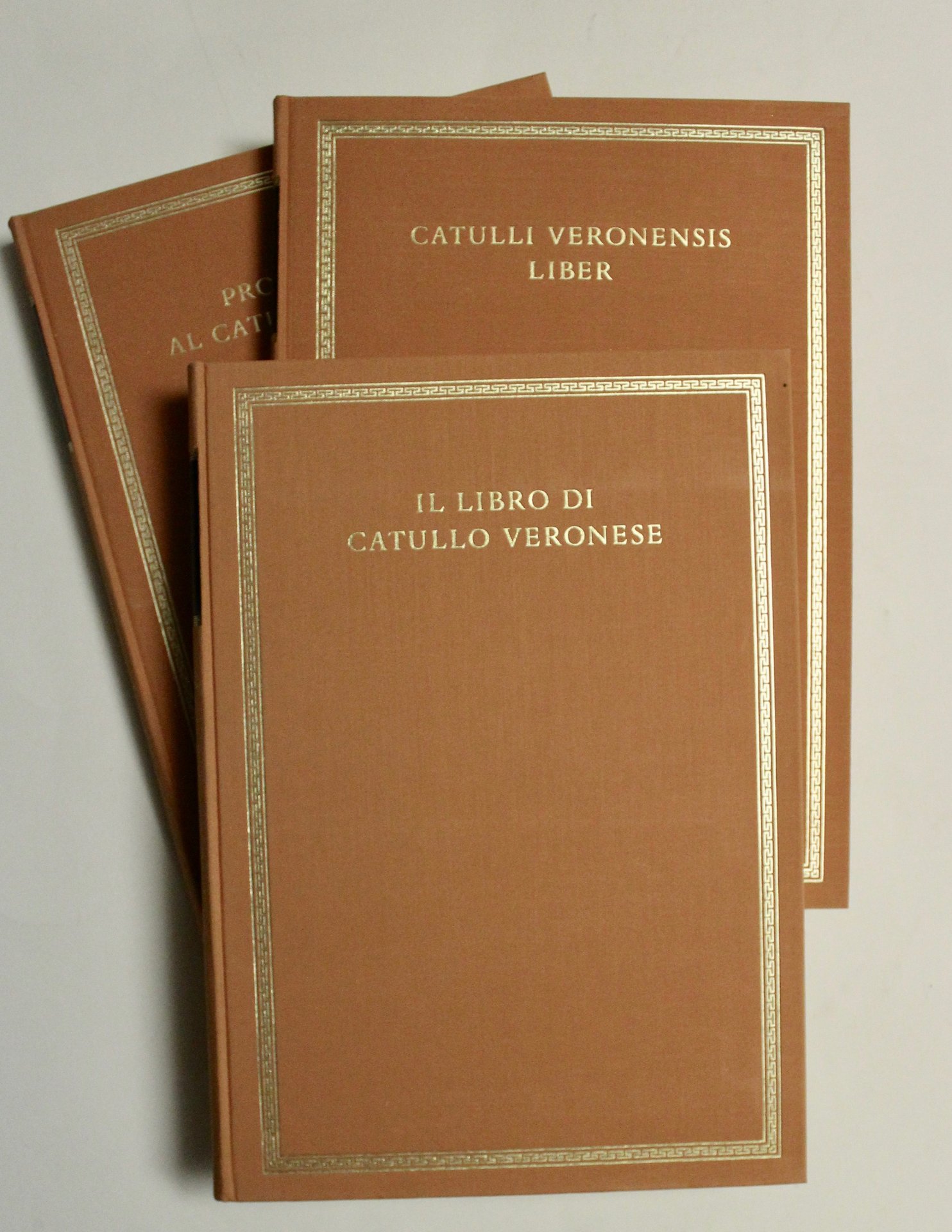 3 volumi in in folio (mm. 325x230); pagg. X, 142, (4) con 1 tav. ripiegata fuori testo illustrante la Transpadana e 20 carte fuori testo recanti una fotografia in bianco e nero per ogni facciata; VI, 106, (4) con 20 carte fuori testo recanti una fotografia (innestata su carta forte) a colori di opere d'arte del periodo romano; VI, 102, (4), con 20 carte fuori testo recanti una fotografia (innestata su carta forte) a colori di opere d'arte del periodo romano. Ogni volume è rilegato in piena tela ocra con cornice decorata con greca, titolo impresso in oro al piatto superiore e al dorso; custodia originale in cartone ricoperto di tela ocra. Taglio superiore di ogni volume dorato.Prolegomeni, testo critico e traduzione a cura di Giovanni Battista Pighi. L'opera è stata impressa dalla Stamperia Valdonega di Verona a cura di Giovanni Mardesteig su carta fornita dalla Cartiera Ventura di Cernobbio. Le incisioni sono di Oliati&Belcaro. La legatura è stata eseguita dalla Legatoria Torriani di Milano. I tre volumi riportano rispettivamente i "Prolegomeni al Catullo Veronese", il "Testo latino" e il "Testo italiano". Esemplare in eccellenti condizioni, come nuovo, assolutamente privo di difetti.