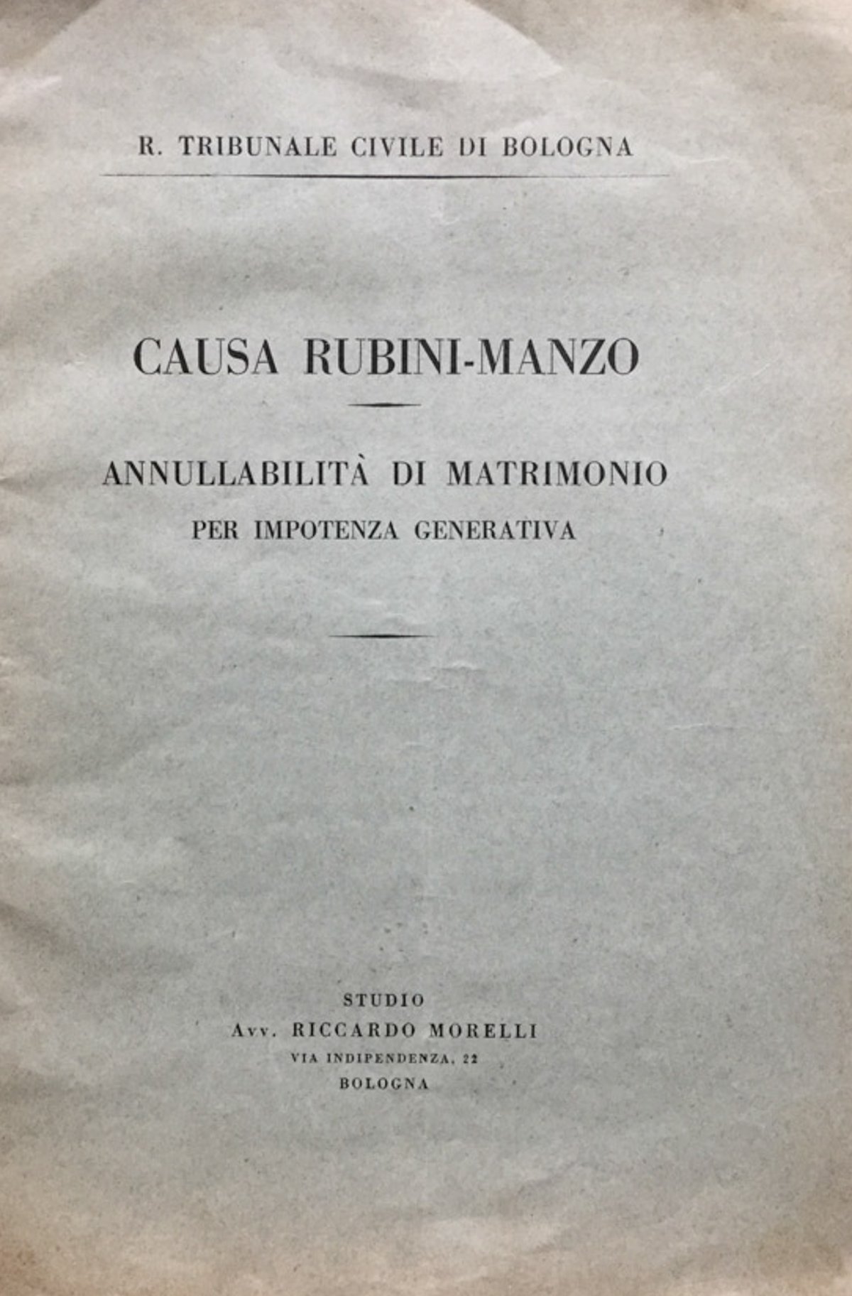 Causa Rubini-Manzo. Annullabilita di matrimonio per impotenza generativa. R. Tribunale civile di Bologna