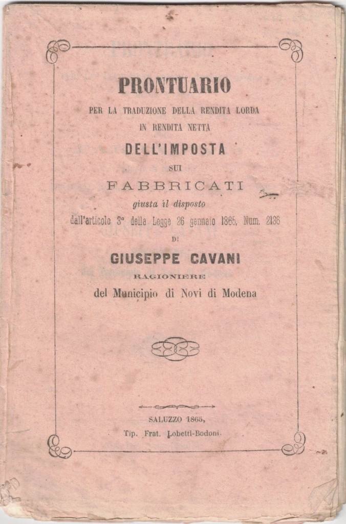 Prontuario per la traduzione della rendita lorda in rendita netta dell’imposta sui fabbricati giusta il disposto dall’articolo 3. della Legge 26 gennaio 1865 num. 2136 di Giuseppe Cavani ragioniere del Municipio di Novi di Modena, Tip. Frat. Lobetti-Bodoni, Saluzzo 1865, pp. 48, cm 19, br. ed. Tracce d’uso alla brossura, per il resto minimi segni del tempo, ma ben conservato. Intonso. Estremamente raro.
