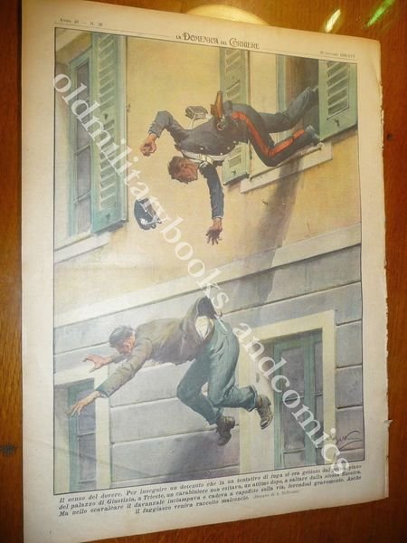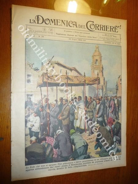 DESCRIZIONE: LA DOMENICA DEL CORRIERE 28 giugno 1938 n. 26 In copertina: La Fede che non si spegne. Pittoresca processione a Turuel in Spagna abbandonata dai rossi. Al retro: Un detenuto si getta dalla finestra dl Palazzo di Giustizia di trieste, ed un Carabiniere si getta dalla stessa finestra per inseguirlo. CONDIZIONI DELL'OGGETTO: Buone, senza sovraccoperta azzurrina, proveniente da rilegatura. PESO/WEIGHT: 43 g without package
