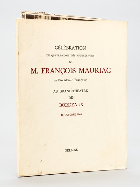 Célébration du quatre-vingtième anniversaire de François Mauriac de l'Académie Française au Grand-Théatre de Bordeaux 18 octobre 1965 [ Edition originale - Avec une carte autographe de François Mauriac ] [Avec : ] Invitation nominative de Michel Suffran [Avec : ] Carton d'invitation