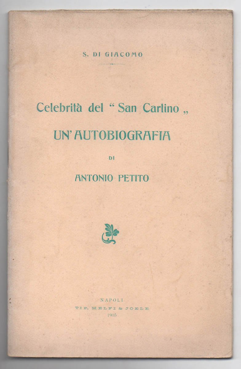 LIBROPrima edizione.Ottimo esemplare intonso.Estratto dalla «Rivista teatrale italiana», Anno V, volume 10, fascicoli 3-4-5, pagine 37-52 (settembre - ottobre - novembre 1905). Scrive Di Giacomo di aver ritrovato uno scritto autobiografico di Antonio Petito (celebre Pulcinella del San Carlino di Napoli), qui pubblicato per la prima volta. Molto raro: censito in biblioteche in sole quattro città nel catalogo SBN.