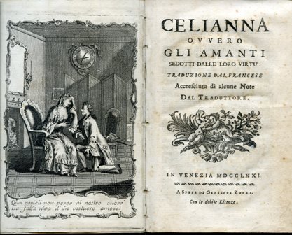 In-8°, pp. 120, (2), legatura moderna p. pelle con fiorellini in oro su dorso a nervetti. Antiporta incisa su rame, vignetta con putti incisa al titolo e fregi tipografici. Lievi fioriture. Buon esemplare. Prima edizione italiana di questo romanzo amoroso anonimo, ma opera di Françoise Albine Benoist Puzin de la Martinière (Lione, 1724-ivi, 1809). Iniziali del traduttore, P.A.Z., in calce alla dedicatoria. Il libro apparve per la prima volta nel 1766 col titolo Céliane, ou les Amans séduits par leurs vertus. Gay / Lemonnyer, I, col. 515. Barbier, I, 547 (per l'edizione francese del 1766). Manca al Melzi. Breghot du Lut / Péricaud aîné, Biographie lyonnaise.- Catalogue des Lyonnais dignes de mémoire, Paris, 1839, p. 32.