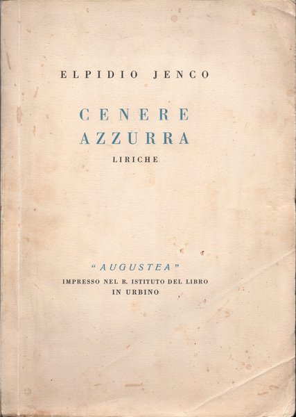 In-8° (25,2 x 17,7 cm), pp. 127, (5), copertina editoriale. Alcune tracce d'uso e del tempo alla copertina, in particolare un paio di segni di piegatura nell'angolo inferiore esterno della copertina anteriore e qualche piccolo, leggero alone. Minimo restauro nella parte inferiore del dorso, per il resto, esemplare ben conservato. Opera tirata in soli 500 esemplari, numerati da 1 a 500: il presente è il numero 86. Edizione originale. La raccolta di liriche è dedicata a una donna amata dal poeta, morta precocemente. Questa figura femminile, chiamata simbolicamente Ofelia D'Alba, detta l'"Amara", non è connotata da alcun tratto biografico legato alla realtà. Tratteggiata quasi in veste di vergine preraffaellita, nei componimenti gli eventi legati alla sua vita sono addolciti dalla memoria e trasfigurati nella contemplazione della natura; l'amata diviene di volta in volta farfalla, fiore o usignolo e la consapevolezza della ineluttabile caducità di tutte le cose terrene trasforma la disperazione in pacata rassegnazione per le sorti umane (cfr. la voce JENCO, Elpidio, in Dizionario Biografico degli Italiani, Volume 62, Roma, Treccani, 2004).