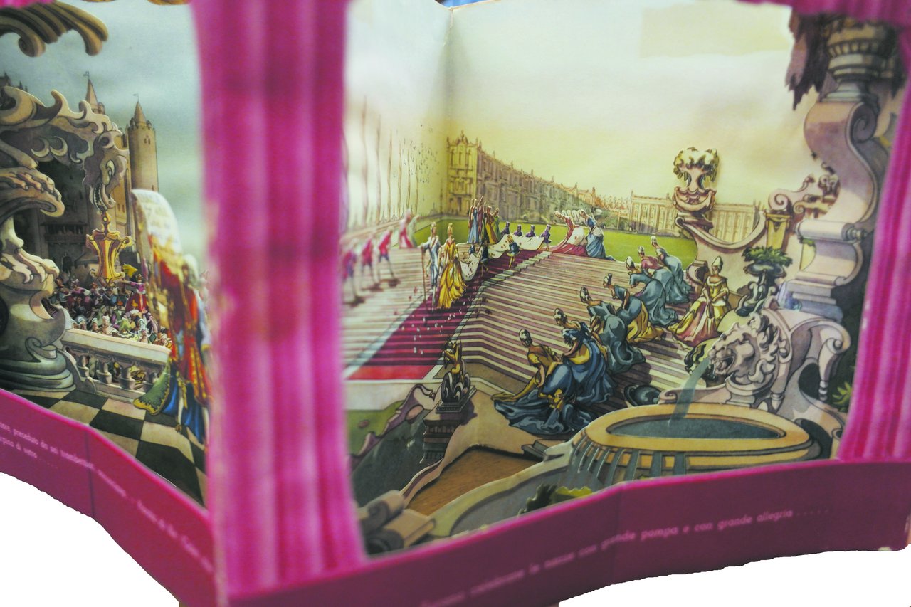 In-8 p. oblungo (mm. 230x260), mz. tela editoriale con piatto anter. figurato a colori e fermaglio. All'interno, sei scene tridimensionali (con quinte e fondali), tutte a colori, disegnate dal pittore scenografo Mario Zampini, dipinte da Raimondo Centurione. Manca, come di consueto, l'annesso piccolo libretto della fiaba. Magnifica edizione, apribile a 360°. Esemplare ben conservato.