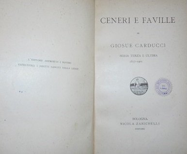 BOLOGNA, ZANICHELLI, 1902. In 16∞: pp. 415. Leg. in t. tela non edit. con fregi in oro al d., conservate le copp. origg. Vol. XI delle "Opere Complete" del poeta, che curÚ questa 1a Edizione dei suoi scritti in 20 voll. fra il 1888 ed il 1905. Cf. Dizion. Biograf. degli Italiani (Treccani). Vol. 20, p. 38. Firma di estinto possesso. Ex libris.