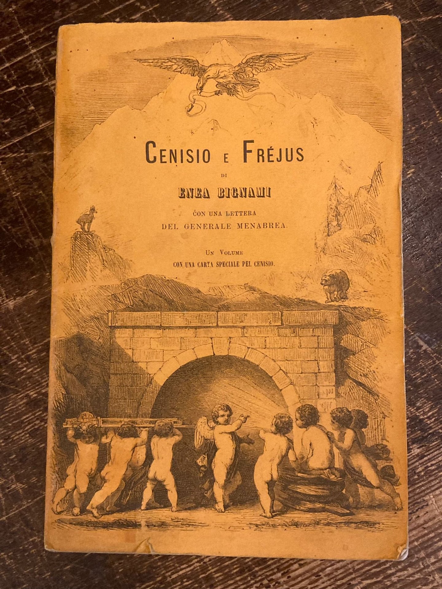 In-8° (19x13 cm), pp. XI (1) 349 (1) bianca, titoli in nero al dorso e al piatto anteriore di bella brossura editoriale figurata arancio, pubblicità editoriali al posteriore. Tra le pp. 42-43, una tav. litografica a p. pag. di 'Veduta delle Alpi da Superga; dal Monte Viso al Monte Rosa'. Tra le pp. 200-201, una tav. con ritratti di Grandis, Sommeiller e Grattoni protetta da velina. Due facsimili di autografi: uno tra le pp. 232 e 233, l'altro ripiegato tra le pp. 310-311. Ripiegata in fine, una grande carta litografica a due colori del Cenisio disegnata da Mayr e Vismara. Minimi restauri conservativi al dorso. Più che buon esemplare. Edizione originale, rara, di questo non comune resoconto della costruzione dei trafori alpini del Moncenisio e del Frejus, scritto dal Bignami ricorrendo ai propri ricordi personali. Scrive encomiasticamente su questo volume Angelo De Gubernatis, nel suo Dizionario biografico degli scrittori contemporanei: 'Nel libro.egli tesse la storia di quell'opera colossale che fu l'apertura della famosa Galleria, per cui Francia e Italia andarono a stringersi la mano nelle viscere del monte 'a Natale, nel giorno della festa d'amore e di lavoro;' e nello stesso tempo ci offre uno schizzo biografico dei principali collaboratori di quell'impresa colossale. C'è cuore, fantasia ed esattezza; sostanza e poesia. Il libro ebbe un felicissimo successo a quel tempo; ma anche adesso, passato il pregio della novità, è e sarà sempre un libro da leggersi con diletto e con profitto'. Il Bignami (1823-1896), lombardo, fu pubblicista, ingegnere, capitano di stato maggiore, scrittore, uomo politico, patriota, diplomatico, consigliere d'amministrazione della ferrovia Vittorio Emanuele. Cfr. Perret, 463 (edizione francese); Bibliografia ferroviaria italiana, 1871, n. 1871978.