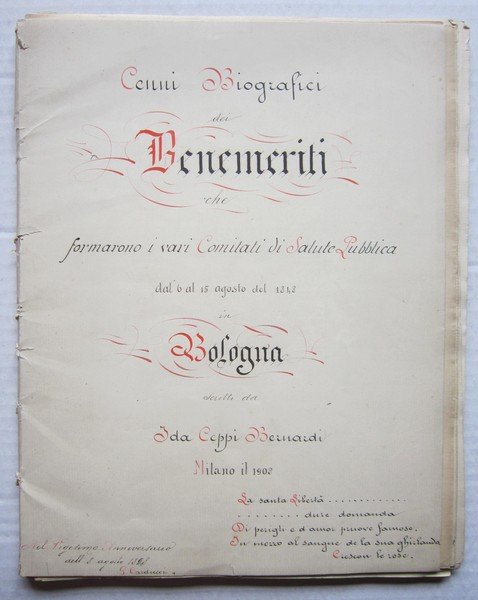 Note: Manoscitto dedicato alla vita del Conte Oreste Biancoli e al Risorgimento bolognese e nella Romagna. In 8°, composto da 74 pp. più 5 dell'allegato Memorandum in formato più piccolo. Il manoscritto è diviso in due parti. Nella prima troviamo una breve biografia degli anni giovanili, i primi Moti a Bologna, l'arresto, la fuga in Francia per evitare l'arresto, il ritorno in Romagna e la partecipazione ai Moti di Rimini con il Conte Beltrami, successivamente ricopre la carica di Direttore della Polizia con lo scopo di riformarla e partecipa in questa veste all'invasione della Romagna da parte degli Austriaci; Dopo la vittoria degli austriaci il Biancoli si esilia nello stato piemontese e qui comincia a ricoprire nuovamente incarichi politici e statali; dopo questo periodo inizia la seconda parte dove troviamo pensieri e scritti del Biancoli politico del neonato Regno d'Italia. Verso la fine troviamo gli allegati contenenti le riproduzioni delle lettere inviate al Biancoli e il Memorandum.