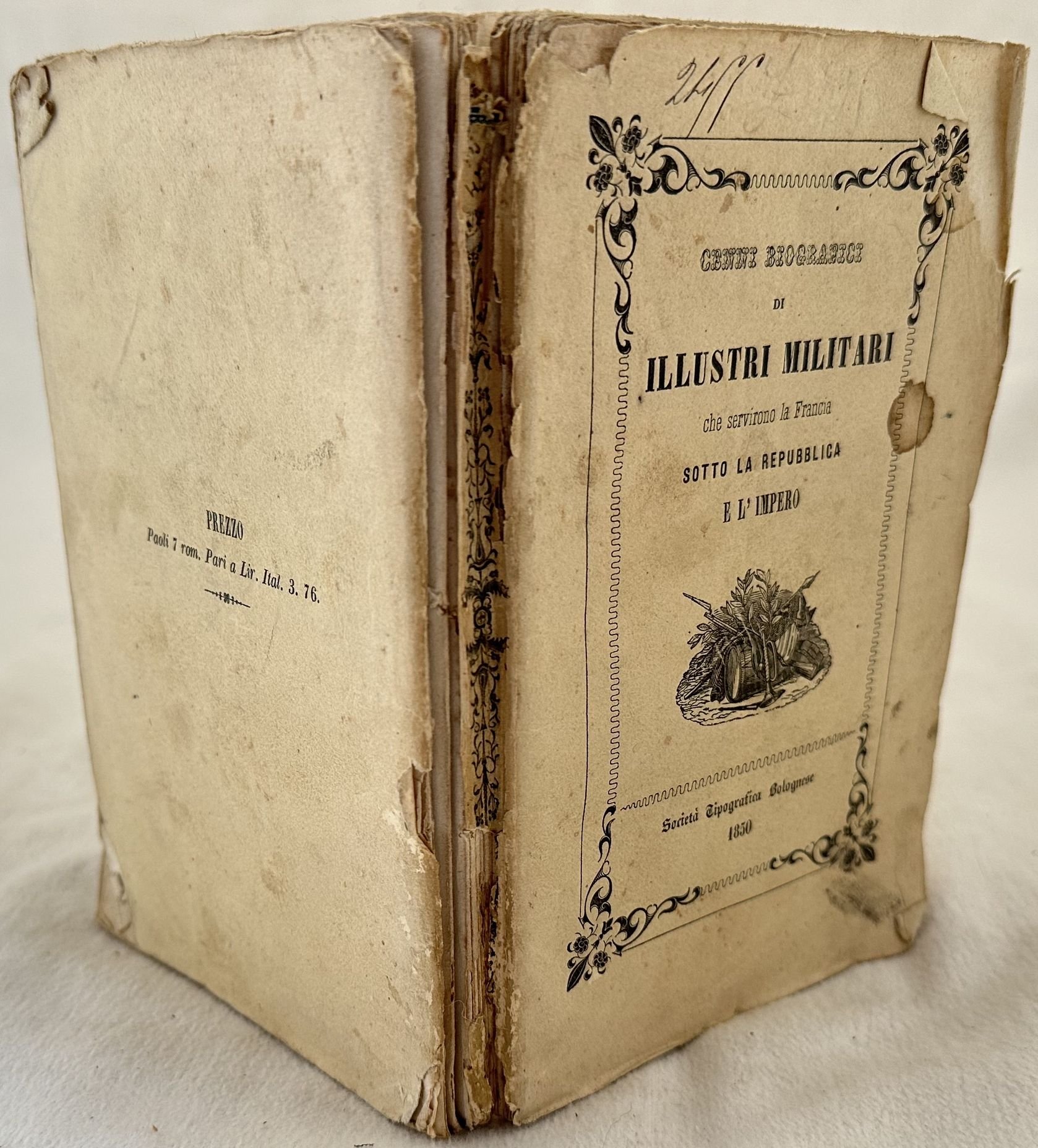 Edizione del 1850 di questa raccolta di vite di militari illustri che servirono la Francia sotto la Repubblica e l'Impero. Sottolineature a matita colorata. In discrete condizioni. Copertina editoriale in discrete condizioni con usure ai margini e dorso. Legatura in discrete condizioni con rotture. Pagine in buone condizioni con fioriture. In 16. Dim. 17,5x11,5 cm. Pp. 199+(1).Edition of 1850 of this collection of lives of illustrious militaries who served France during Republic and Empire. Undferinings with coloured pencil. In fair conditions. Editorial cover in fair conditions with wearings in the extremities. Binding in fair condtions with cracks. Pages in good conditions with foxing. n 16. Dim. 17,5x11,5 cm. Pp. 199+(1).