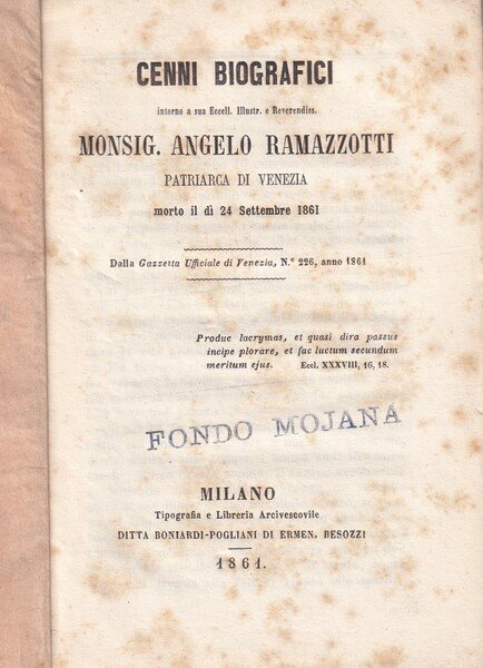 *Cenni biografici intorno a sua Eccell. Illustr. e Reverendiss. Monsig. Angelo Ramazzotti patriarca di Venezia.