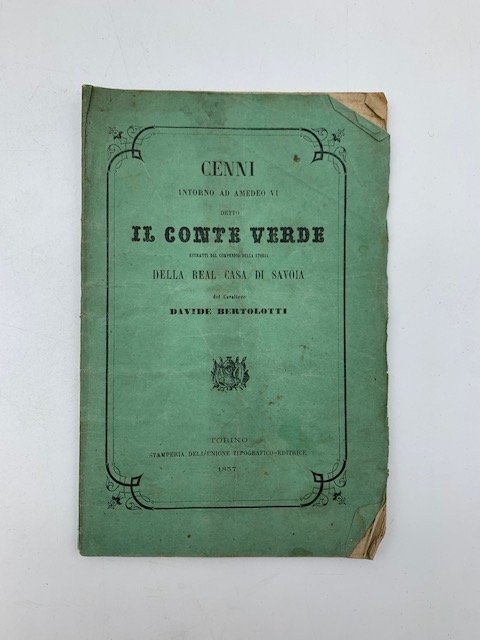 In 16 (cm 11 x 17 circa), pp. 15 + (1 bianca). Brossura editoriale con qualche alone e pieghette al piatto posteriore. Estratto editoriale dal Compendio della Storia della Real Casa di Savoia con cenni sulla vita di Amedeo VI.