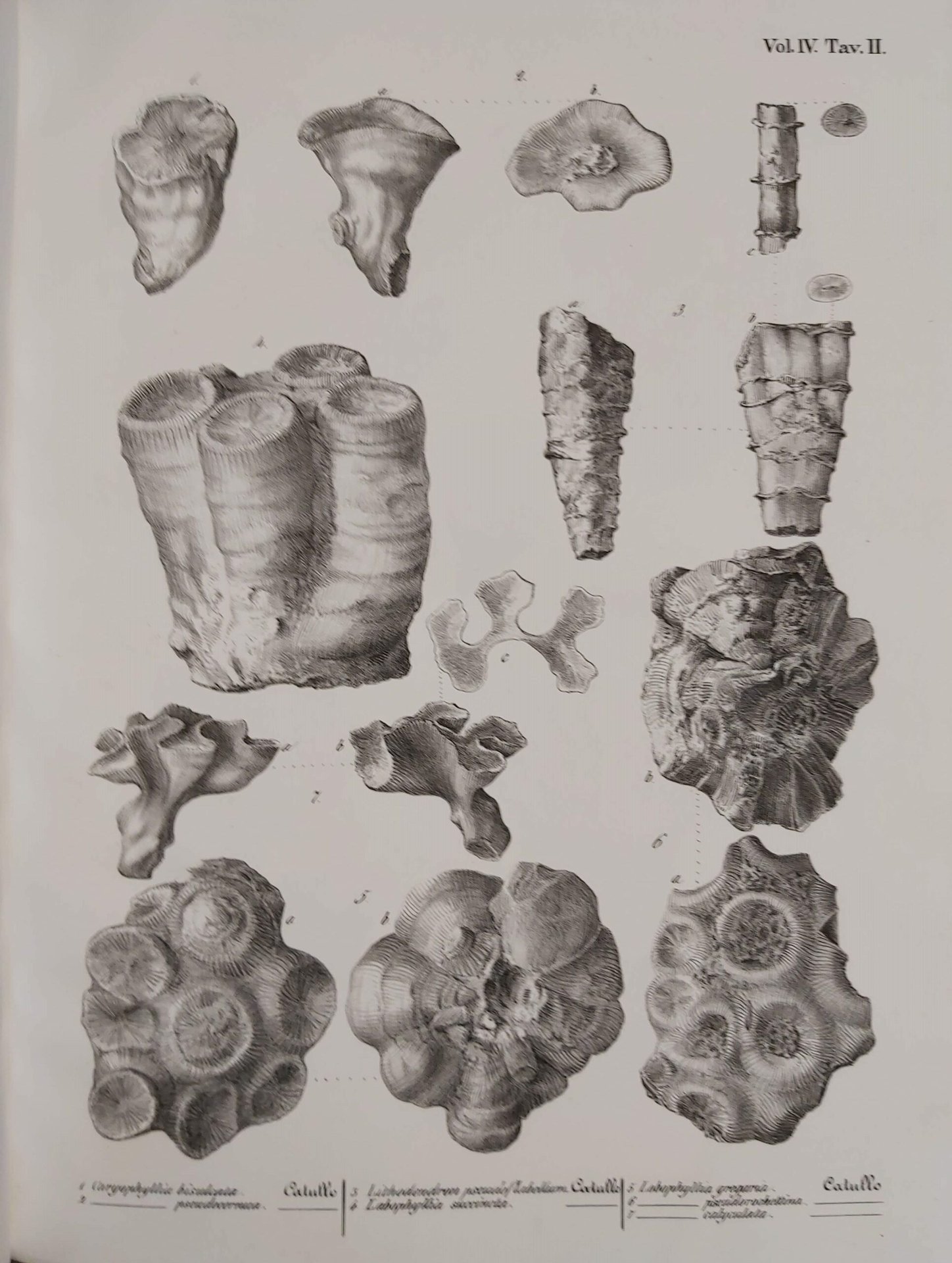 in-folio, pp. 44, leg. mod. in c. dec. Con 4 tavv. litogr. alla fine raff. i fossili descritti n.t. I fossili descritti provengono da Castel Gonberto, Valle Pantena, Val d' Agno, Montecchio, Creazzo, Sant' Urbano etc. [281]