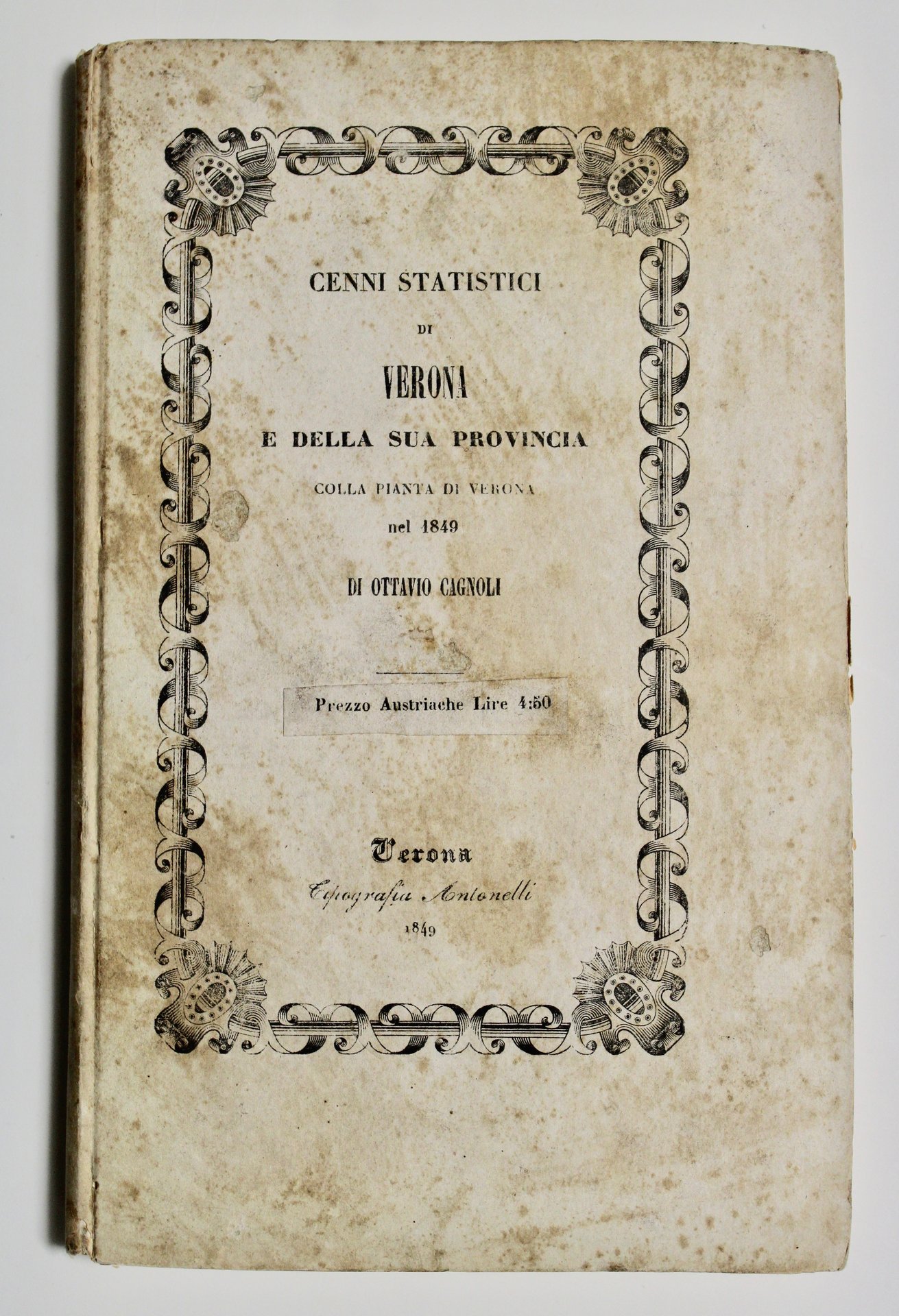 In 8°(225x145). Pagg. VIII, 150. Con 1 grande e magnifica tavola litografica ripiegata più volte fuori testo, raffigurante la pianta topografica di Verona. Cartonato editoriale con titiolo in nero al piatto sup. entro bordura. Dedica ad Andrea Monga. L'opera rivela in modo esauriente un ampio panorama paesaggistico ed antropico della zona veronese, dando cenni statistici della città e provincia dalla posizione geografica passa in rassegna tutti gli elementi naturali del territorio, quali: Adige, boschi, torrenti e valli, fossili, Lago di Garda, marmi, Montebaldo; riguarda inoltre tutti gli elementi caratterizzanti l'antropizzazione del luogo, dalla popolazione alle industrie, alberghi, agricoltura, sanità pubblica, chiese, caserme, teatri, monumenti, palazzi, personaggi celebri ed illustri veronesi, ecc. Bell'esemplare genuino, ben conservato.
