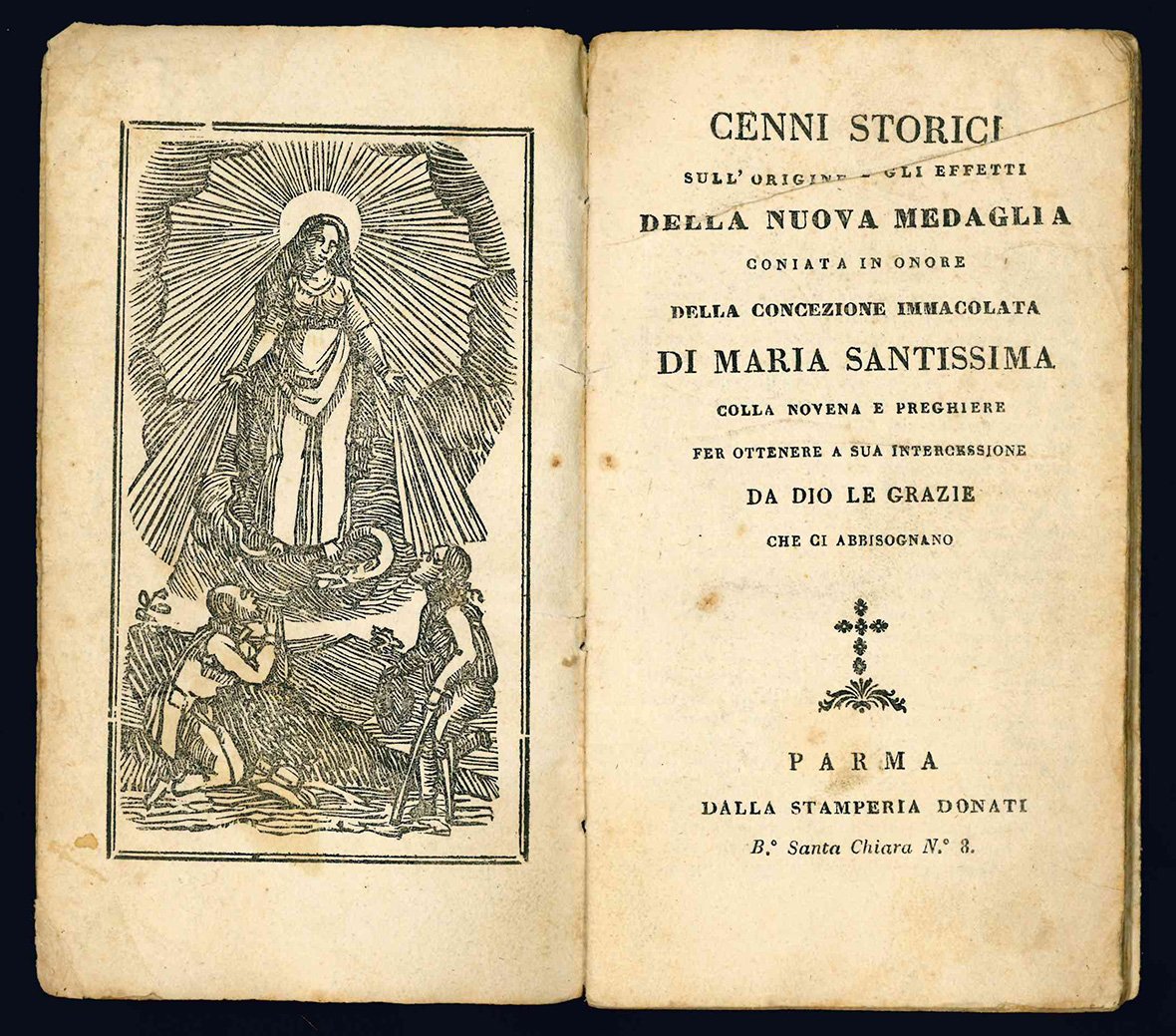 Cenni storici sull'origine e gli effetti della nuova medaglia coniata ad onore della concezione immacolata di Maria Santissima colla novena e preghiere adatte per ottenere a sua intercessione da Dio le grazie che ci abbisognano.