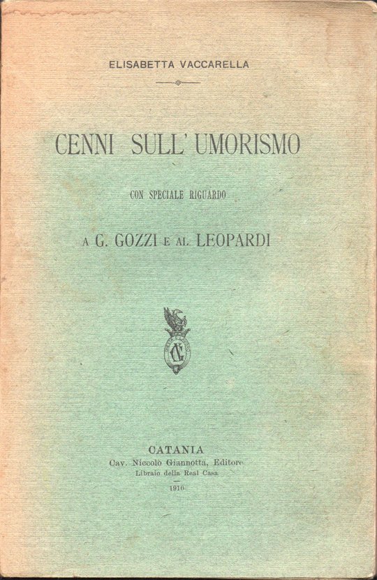 In-8° (23 x 14,8 cm) pp. 114, (2), copertina editoriale. Qualche normale segno d'uso e del tempo alla copertina, in particolare, un leggero alone d'umido nel bordo superiore e, alla copertina posteriore, un segno di piegatura nell'angolo superiore esterno (N. B.: nella foto a corredo della presente scheda descrittiva, il colore è leggermente più chiaro di quanto non sia in realtà). Leggero alone d'umido nel margine superiore delle prime pagine, lontano dal testo. Agli ultimi due fogli della pubblicazione, segni di piegatura nell'angolo superiore esterno. Per il resto, ben conservato. Indice: Capitolo I. Dell'umorismo e del suo svolgersi nella letteratura. Capitolo II. L'umorismo nelle opere di Gasparo Gozzi. Capitolo III. L'umorismo nelle prose di G. Leopardi.