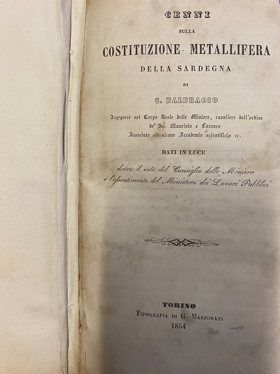 vol. unico, formato in 8°- leg. in mezza pelle con carta marmorizzata ai piatti- titolo e fregi al dorso- timbro con iniziali al frontespizio- risguardie successive, tracce di umidità alle prime 20 pagine- 6 tav f.t ripiegate, con sezioni di ambienti minerari- la prima tavola presenta un risforzo, ed anche la tav. VI in corrispondenza della cerniera - manca carta non numerata con dati ed. - 530 pagine .copia non eccellente ma NON COMUNE