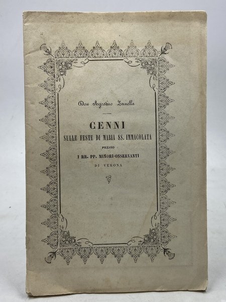 Brossura editoriale a stampa con titoli entro cornice, in ottavo cm 22x14, pp 22; all’antiporta tavola litografica ripiegata raffigurante Interno della Chiesa di S. Zeno in Verona addobbata nell’occasione dello straordinario solenne Triduo dell’Immacolata celebrato dai Padri Minori Osservanti nei giorni 17, 18, 19 marzo 1855,