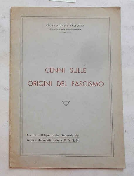 In 4° (cm. 29,5 x 20,5); pagg. 31; leggera cartonatura origin. VG. ** Lezione di cultura fascista per le CC.NN. iscritte ai Corsi Allievi Ufficiali di Complemento presso le Università, tenuta nell'Aula Magna della R. Università di Roma il 23 marzo XV° annuale della fondazione dei Fasci di Combattimento." A cura dell'Ispettorato G.le dei Reparti Universitari della M.V.S.N.