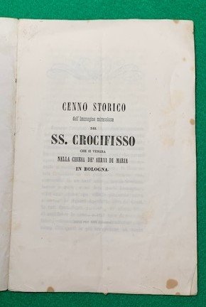 In 8°; 14, (2) pp. Brossura grigia muta coeva. Prima rara edizione, un solo esemplare censito in ICCU, di questo interessante studio storico dedicato alla storia del miracolo Crocifisso venerato nella Chiesa de' Servi di Maria in Bologna, scritto dal noto storico e prolifico pubblicista bolognese, Salvatore Muzzi, notissimo per il suo monumentale lavoro degli "Annali della città di Bologna dalla sua origine al 1796" (I-VIII, Bologna 1840-46), nei quali, avvalendosi di numerose fonti (e in particolare degli Annali di Ludovico Savioli), ricostruì la storia della città felsinea a partire dall'anno 1116. Raro.