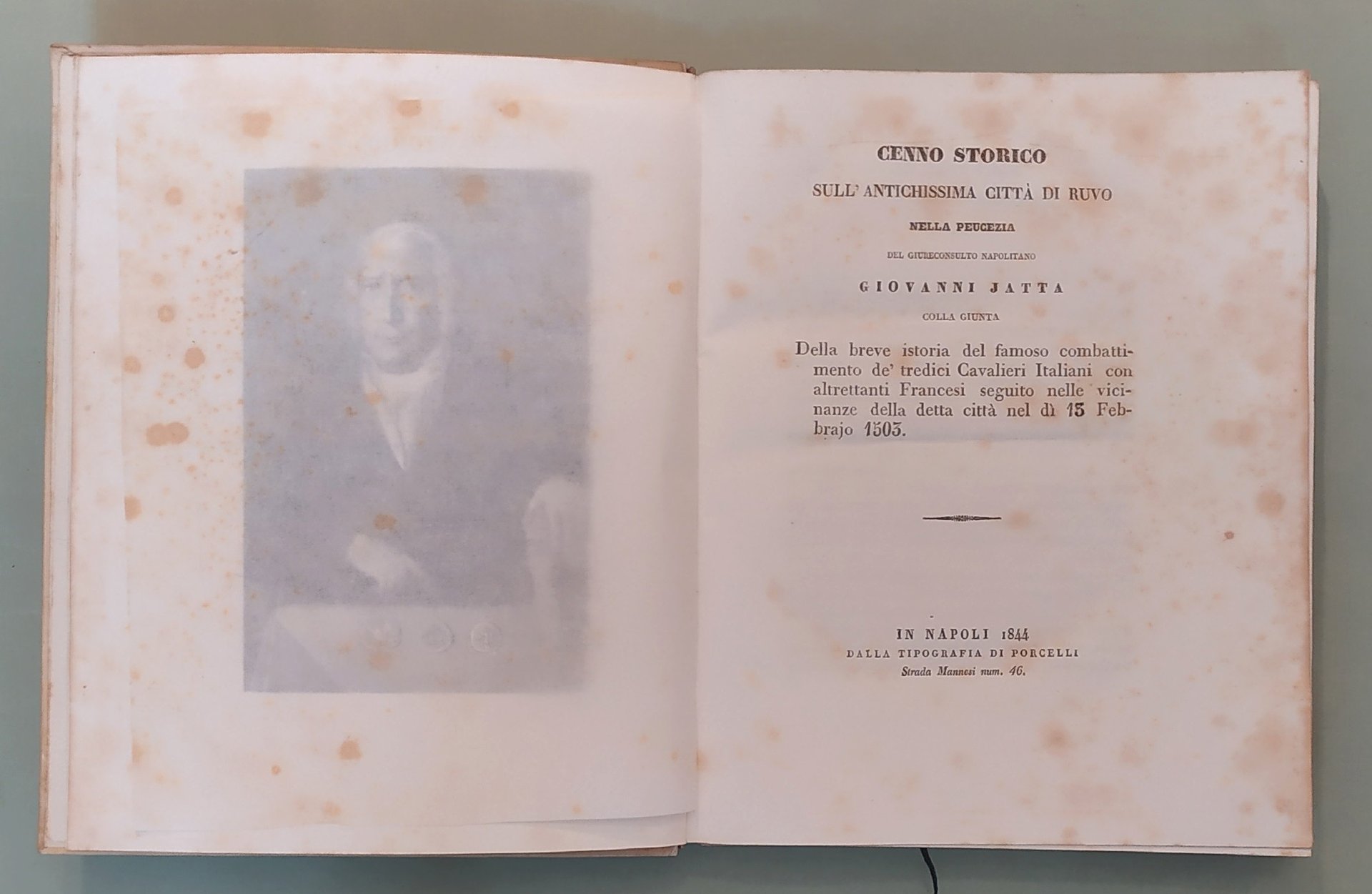 Cenno storico sull'antichissima Città di Ruvo nella Peucezia. Colla giunta della breve istoria del famoso combattimento de' tredici Cavalieri Italiani con altrettanti Francesi seguito nelle vicinanze della detta città nel dì 15 Febbrajo 1503.
