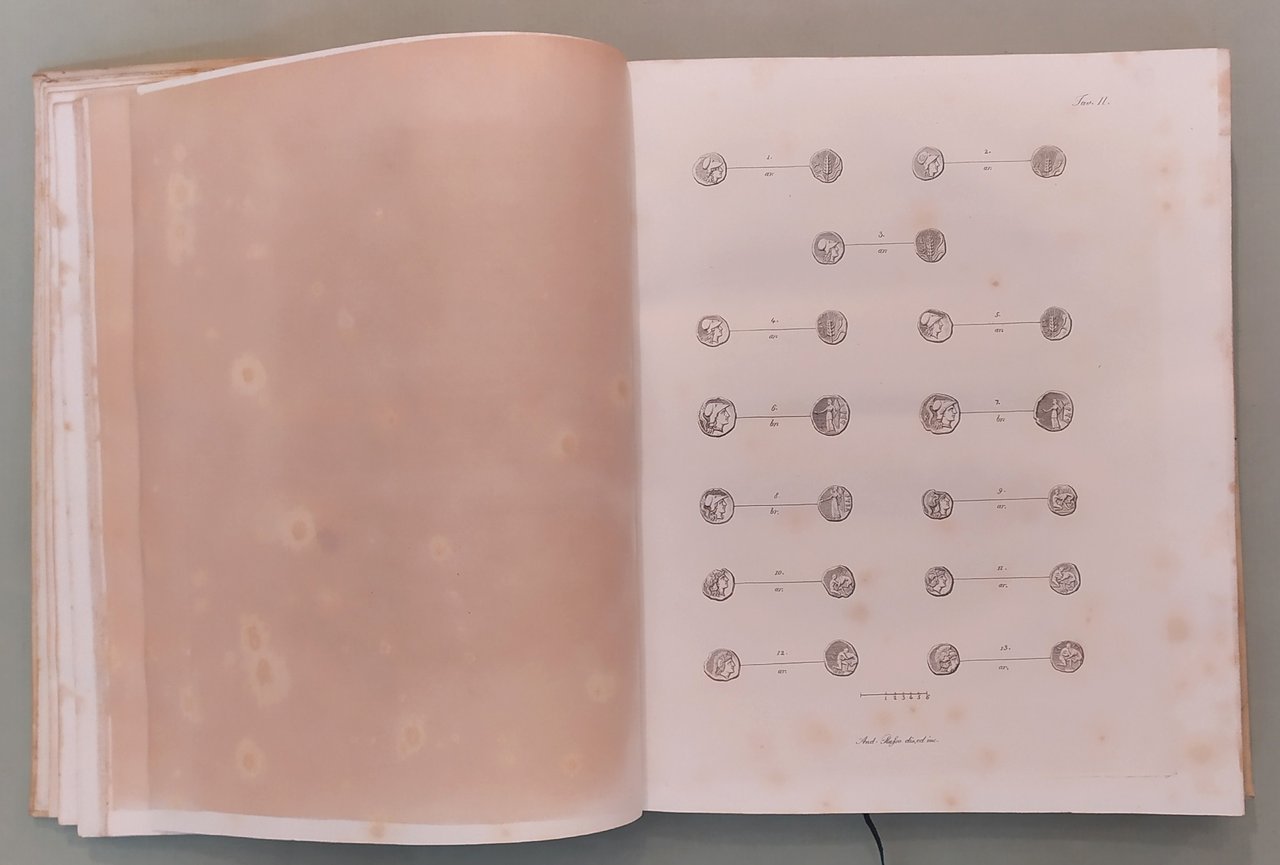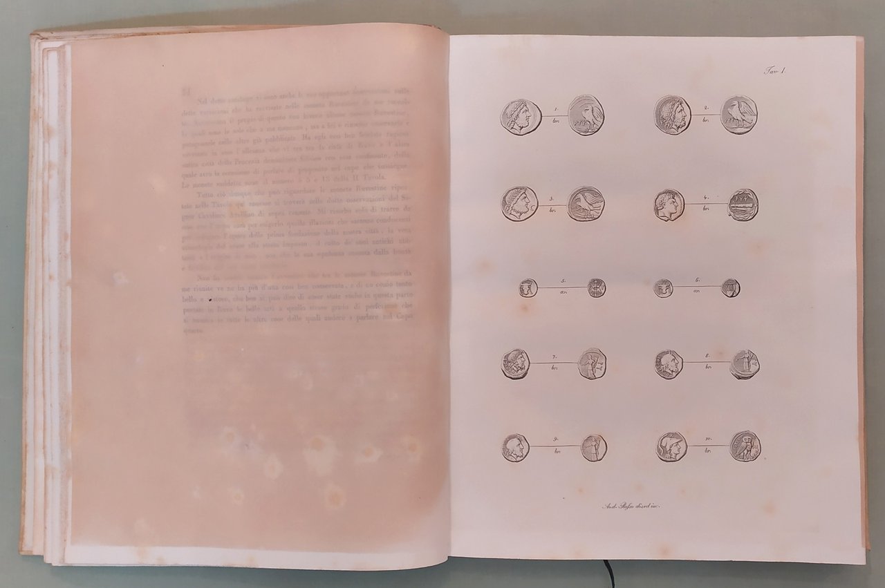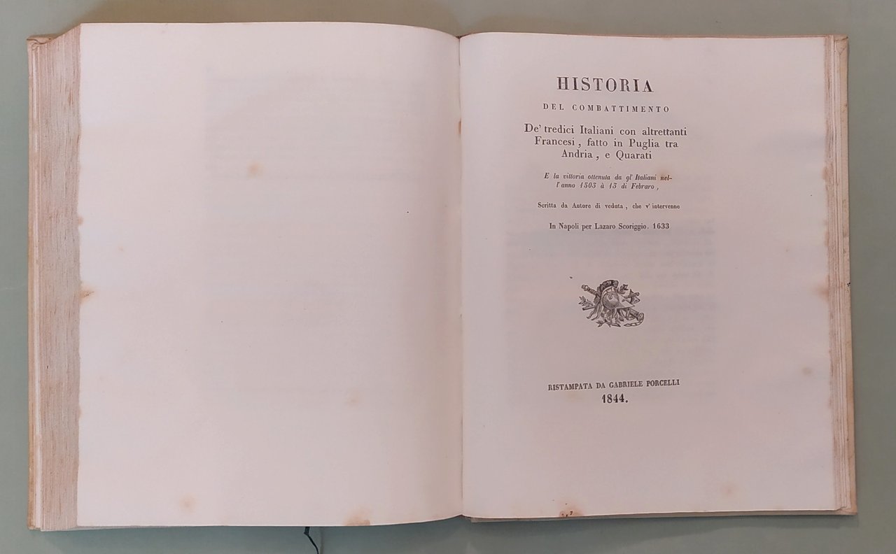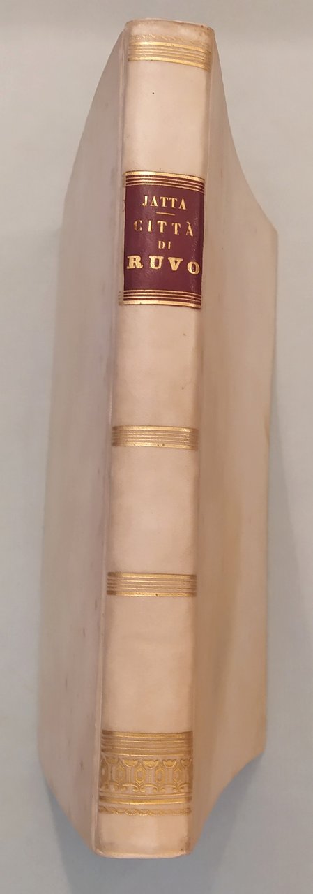 In Napoli, dalla Tipografia di Porcelli, 1844. In 4to; pp.348, 30, 1 carta bianca, 40. Ritratto dell'autore, 2 tavole di monete. Ritratto e tavole protette da velina. In fine con frontespizio proprio la storia del combattimento "fatto in Puglia tra Andria e Quarati nell'anno 1503". Pergamena coeva, tassello al dorso con titolo e fregi in oro. Lozzi, 4648; Bottega Apulja, Meridionalia, 2764: "Raro".