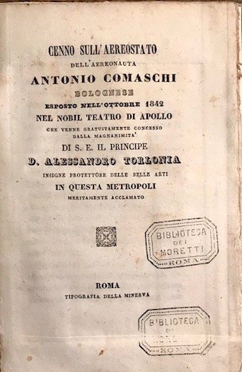 Cenno sull’aereostato dell’aereonauta Antonio Comaschi bolognese esposto nell’ottobre 1842 nel nobil Teatro di Apollo che venne gratuitamente concesso dalla magnanimità di S.E. il Principe D. Alessandro Torlonia.