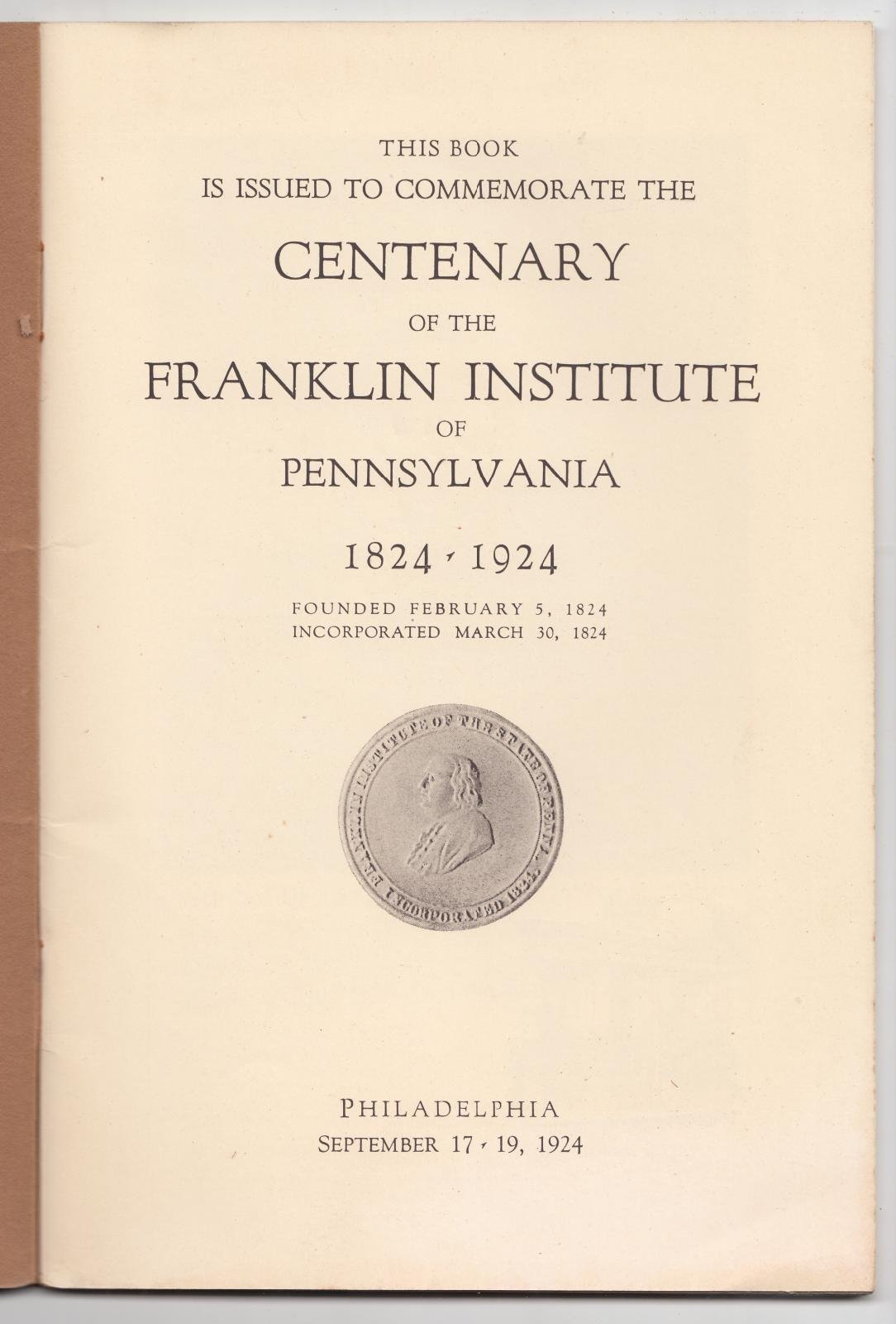 CENTENARY OF THE FRANKLIN INSTITUTE OF PENNSYLVANIA 1824-1924 PHILADELPHIA-L3840