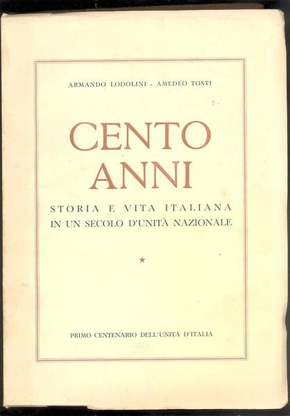 IN 4° ( cm.29,5 X 21,5 ), pp. 597, COPERTINA EDITORIALE CON TITOLO ENTRO CORNICE RIPORTATO ANCHE AL DORSO.14 INCISIONI IN LEGNO ORIGINALI a pp. f.t. DI PINO<BR>STAMPINI. I CENTO ANNI, SI APRONO CON LA STORIA DEI 100 ANNI. E SOLO L'ESPERTA PENNA DI UNO STORICO COME AMEDEO TOSTI POTEVA DARCI QUESTA FELICE SINTESI AL FAVORE DEGLI ITALIANI. ATTRAVERSANDO FORTUNE E SFORTUNE, RIECHEGGIANDO GUERRE, VITTORIE E SCONFITTE, DESCRIVENDO GOVERNI E REGIMI, QUESTO QUADRO DELLA STORIA CENTENARIA D'ITALIA CREA, DUNQUE, LA NECESSARIA PREMESSA ALLA VITA DEL SECOLO, NELLE SUE MOLTEPLICI MANIFESTAZIONI. L'OPERA , SI COMPONE DI DUE LIBRI OGNIUNO A SE STANTE. LIBRO I - AMEDEO TOSTI - CENTO ANNI DI STORIA. LIBRO II - ARMANDO LODOLINI - CIVILTA' ITALIANA NEL PRIMO SECOLO DELLA PATRIA. LA PRESENTE SCHEDA, SI RIFERISCE AL I LIBRO DEL TOSTI. PINO STAMPINI ( SANTHIA 1905 - ROMA 1992 ), PITTORE E INCISORE. HA ESPOSTO ALLA XIX e XX BIENNALE DI VENEZIA, ALLA III QUADRIENNALE DI ROMA. E' STATO ANCHE GIORNALISTA. FONDO' CON GUIDO PALLOTTA " VENT'ANNI "; FONDO' E DIRESSE FINO AL 1939 " IL LAMBELLO ", ORGANO DEL FASCISMO UNIVERSITARIO DEL PIEMONTE. OPERA IN PERFETTO STATO DI CONSERVAZIONE, SIA NEL TESTO CHE NELLE XILOGRAFIE. RARO.SOTTO L'ALTO PATRONATO DELLA UNIONE<BR> ITALIANA CIECHI.ID 2676<BR>