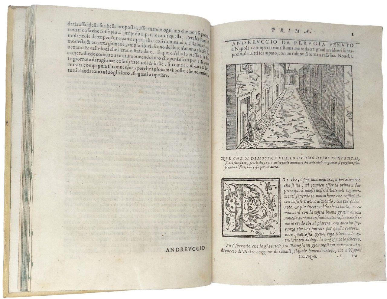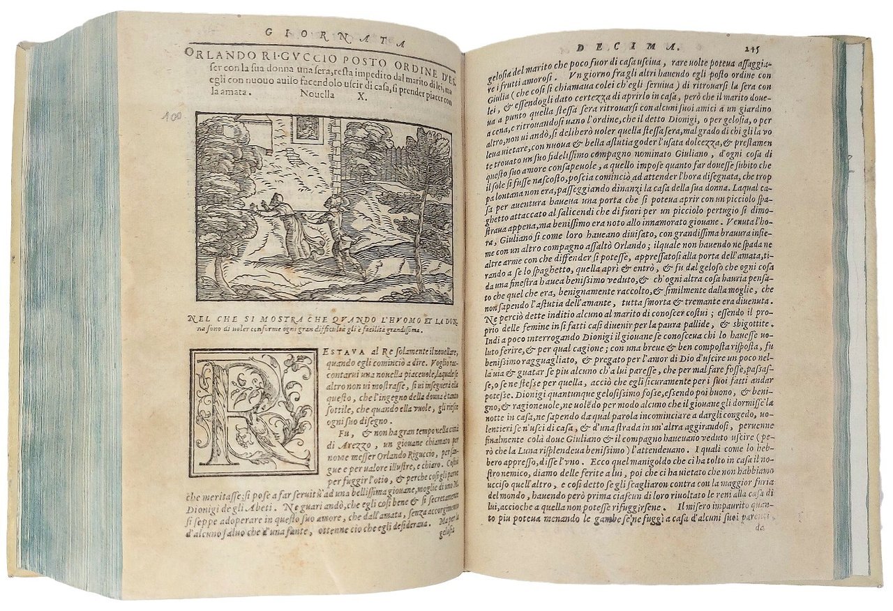 >in-4 (200x145 mm), ff. (14), 245, (1 b.), (6, di cui l'ult. bianco), 31, (1b.), legatura settecentesca p. perg. rigida, tit. oro al dorso, tagli azzurri. Impresa tipogr. al titolo, grandi iniziali xilografiche ornate, 100 figure in legno nel testo, assai belle, grandi un terzo di pagina (65x100 mm), ad illustrazione delle novelle. Benché sul titolo si dica "quarta impressione", in effetti trattasi della quinta che secondo il Gamba è anche la migliore (la prima era apparsa nel 1561). Precedono la dedica di Sansovino a Sigismondo de' Cavalli, "eletto oratore al Ser.mo Duca di Savoia", e "Un discorso fatto sopra il Decamerone", che appare qui per la prima volta, in cui Sansovino discorre sul titolo dell'opera, sull'intenzione e lo stile dello scrittore e sull'arte di scrivere le novelle. Alla maniera del Boccaccio, Sansovino organizza l'opera in dieci giornate, con dieci novelle ciascuna, ricavandole da vari autori, dei quali mai riferisce il nome. Gli ultimi 32 fogli contengono "Le Ciento Novelle antike". Bell'esemplare, alone d'umido ai primi fogli. Gamba 2728 "...tiene il posto di onore in una raccolta di Novellatori". Passano, Novellieri Italiani, I, p.544. BMC 606.