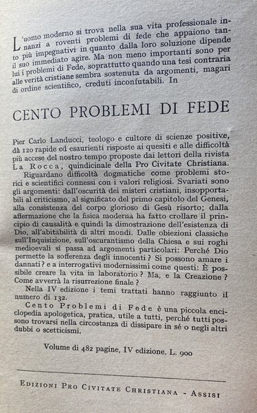 In CENTO PROBLEMI DI FEDE Pier Carlo Landucci, teologo e cultore di scienze positive, dà 120 rapide ed esaurienti risposte ai quesiti e alle difficoltà più accese del nostro tempo proposte dai lettori della rivista La Rocca, quindicinale della Pro Civitate Christiana. Riguardano difficoltà dogmatiche come problemi storici e scientifici connessi con i valori religiosi. Svariati sono gli argomenti: dall'oscurità dei misteri cristiani, insopportabili al criticismo, al significato del primo capitolo del Genesi, alla consistenza del corpo glorioso di Gesù risorto; dalla affermazione che la fisica moderna ha fatto crollare il principio di causalità e quindi la dimostrazione dell'esistenza di Dio, all'abitabilità di altri mondi. Dalle obiezioni classiche sull'Inquisizione, sull'oscurantismo della Chiesa e sui roghi medioevali si passa ad argomenti particolari: Perché Dio permette la sofferenza degli innocenti? Si possono amare i dannati? e a interrogativi modernissimi come questi: È possibile creare la vita in laboratorio? Ma, e la Creazione? Come avverrà la risurrezione finale? Nella IV edizione i temi trattati hanno raggiunto il numero di 132. Cento Problemi di Fede è una piccola enciclopedia apologetica, pratica, utile a tutti, perché tutti possono trovarsi nella circostanza di dissipare in sé o negli altri dubbi o scetticismi.