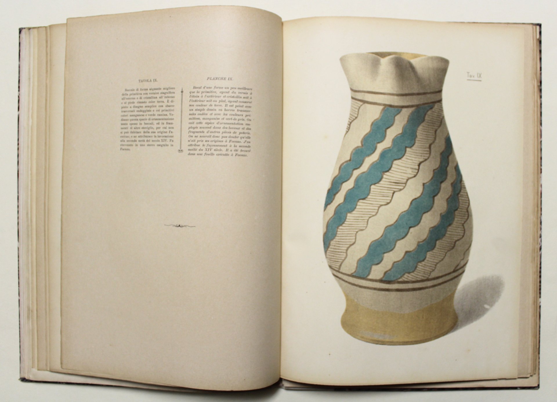 In folio (mm. 340x245); pagg. (6), 39, con XXII tavole (di cui due ripiegate) illustranti ceramiche in cromolitografia e altrettante carte a fronte con la descrizione tecnica del reperto, eccetto la tav. XXII che è descritta in 3 carte, le ultime due slegate. 6 illustrazioni nel testo, frequenti piccoli fregi e iniziali decorate. Sguardie marezzate. Mezza pergamena coeva con piatti in cartone marezzato, titolo e autore impressi in oro su tassello in marocchino rosso al dorso decorato con fregi dorati. All'interno è conservata anche la brossura editoriale completa di dorso. <BR>Edizione originale di questa terza fatica editoriale dell'Argnani sulle ceramiche faentine dopo quelle del 1889 (Le ceramiche e maioliche faentine) e del 1898 (Il rinascimento della ceramica maiolicata faentina), uscita in sole 200 copie (di cui il presente è l'esemplare n° 17), in seguito alla pubblicazione di alcune opinioni del prof. Gaetano Guasti in cui si metteva in dubbio il primato temporale delle fabbriche ceramiche faentine. Infatti, come dichiara l'editore nell'introduzione, "Il presente volume … esce alla luce in momento opportuno per confutare recenti opinioni, le quali tendevano a contrastare a Faenza il primato delle sue fabbriche sopra le altre Italiane nell'uso della vernice stagnifera. Interessantissima quindi ed in specie per il ricco materiale raccolto ed ordinato diligentemente dal chiarissimo autore, esposto nelle XXII tavole di stoviglie riprodotte in cromo e nelle VI incisioni intercalate nel testo, le quali provano quanto l'arte faentina fosse in avanti, mentre taceva altrove." A fronte del testo è stata posta la traduzione francese. <BR>Ottimo esemplare, molto elegante e con ampi margini, con leggere e marginali fioriture. Le ultime due carte sono slegate.<BR><BR>
