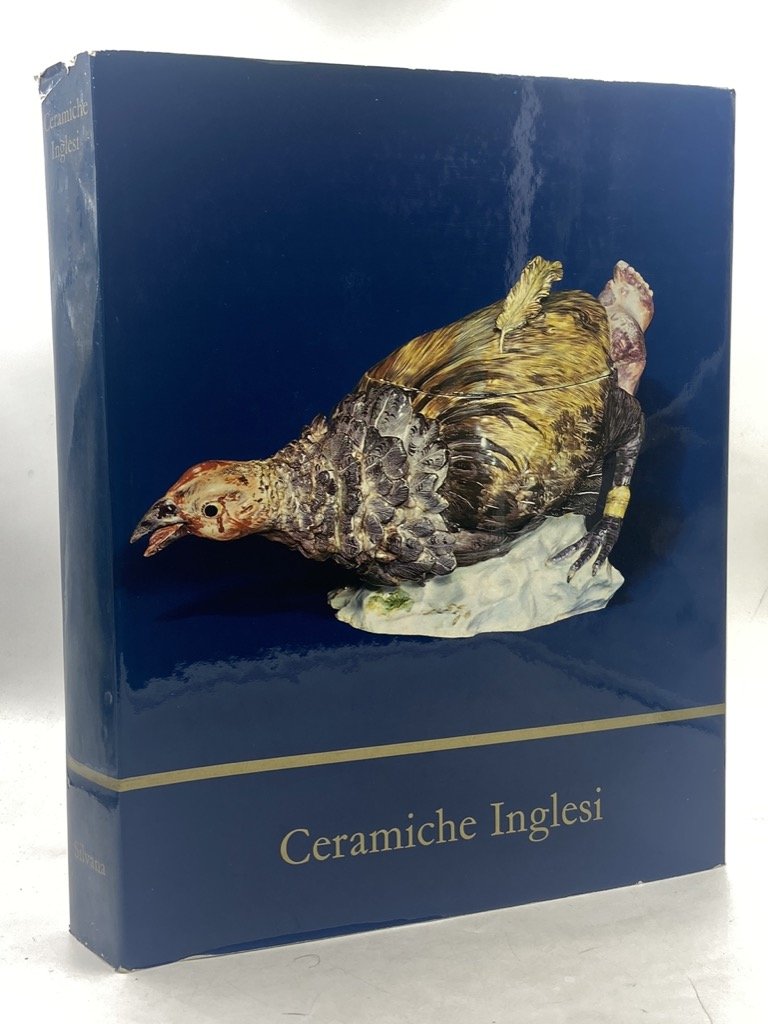 Tela editoriale con sovraccoperta illustrata (piccoli difetti sui bordi) in custodia in cartoncino muto, cm 34 x 26.5, pp 433 (1), 184 tavole (alcune a colori, applicate). Edizione italiana, a cura di Beatrice Casavecchia Aragno, di «British Pottery and Ceramics» di George Savage, con 184 manufatti schedati e presentati in grandi fotografie in rotocalco o a colori applicate; stampato a Friburgo dalla tipografia Office du Livre.