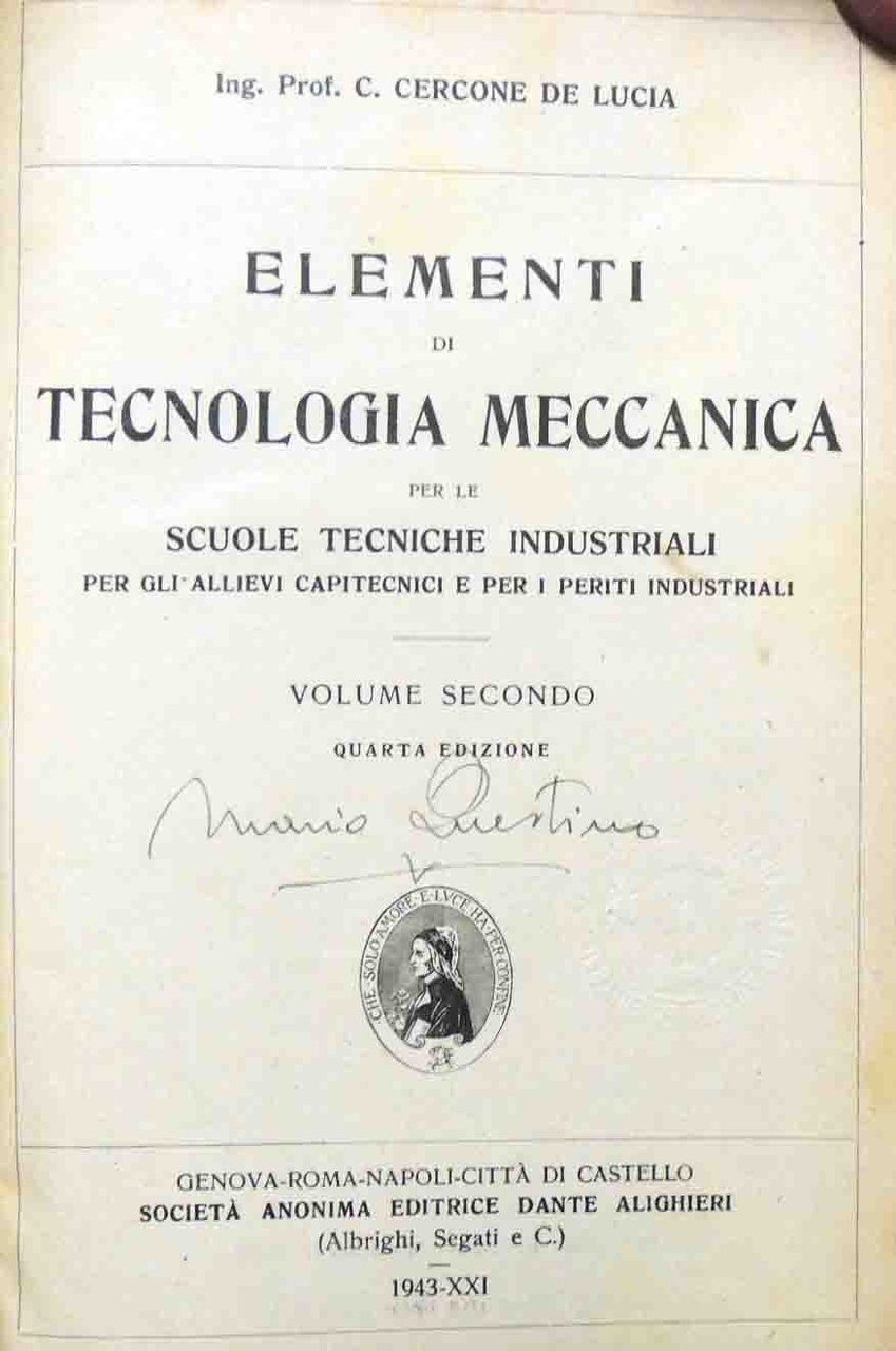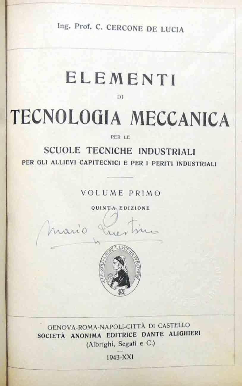 Carlo Cercone De Lucia, Elementi di tecnologia meccanica. Per le Scuole Tecniche Industriali. Per gli Allievi Capitecnici e per i Periti Industriali, Società Anonima Editrice Dante Alighieri (Albrighi, Segrati e C.), Genova 1943, 2 voll., pp. XXI, 1243, ill. b.n., 1 c. di tav. f.t. ill. col., cm 21, legatura in mezza tela muta. Opera completa in due volumi. Volume primo: 1943, quinta ed., pp. IX, 596. Volume secondo: 1943, quarta ed., pp. XII, 647. Firma d’appartenenza al frontespizio di ciascun volume. Minime fioriture, lieve brunitura della carta, qualche sporadico segnetto di lapis, per il resto ben conservati, freschi gli interni.