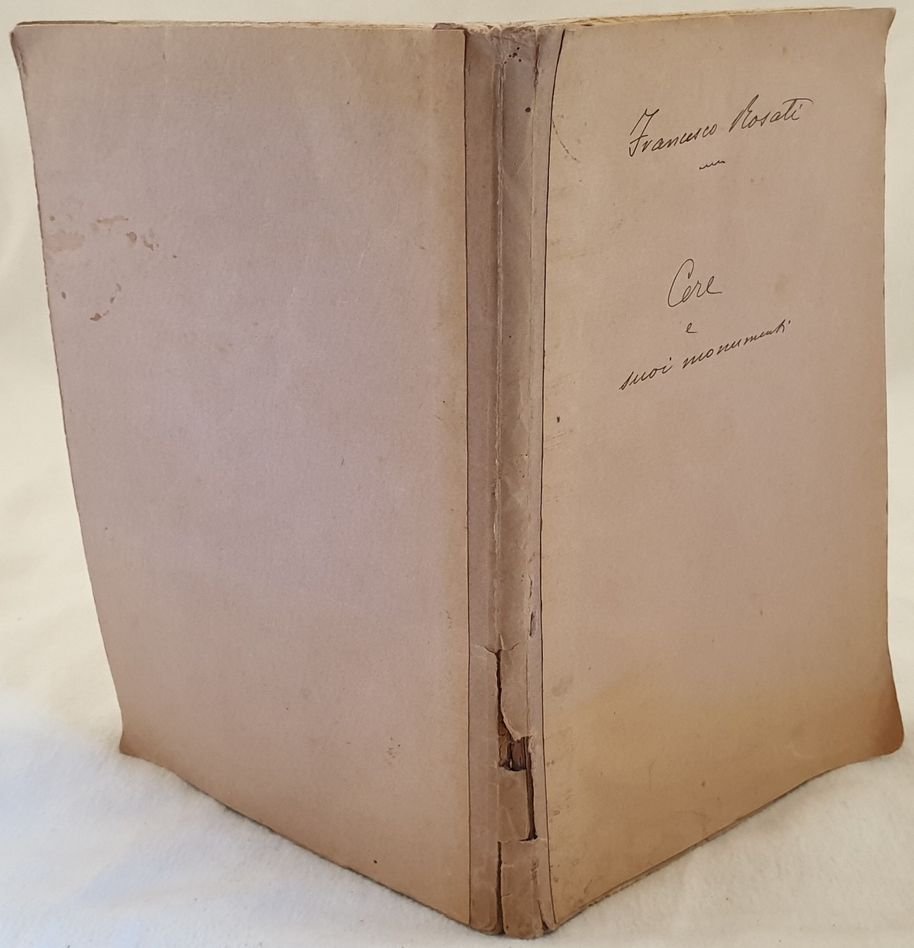 Edizione originale del 1890 di questa monografia sulla storia di Cerveteri scritta da Francesco Rosati Cere, prima Agilla, è il nome dell'area dove oggi è Cerveteri. Importante studio che parte dalla fondazione di Agilla e Cere fino ad Alessandro VI e il dominio degli Orsini, e l'insediamento della famiglia Ruspoli (che al tempo in cui fu scritta l'op. era ancora padrona del territorio), corredata da un'ampia documentazione e indice descrittivo. Ad es.sotto il nome di Alessandro VI si legge: Sdegno di questo pontefice per la vendita di Cerveteri a Virginio Orsini. In discrete condizioni. Copertina morbida coeva con titolo manoscritto al dorso in discrete condizioni generali con usure e mancanze al dorso. Legatura in discrete condizioni con rotture. Pagine in buone condizioni con rare fioriture. In 8. cm 25x17. Pp. (4)+221.Original edition of 1890 of this monography anout the history of Cerveteri written by Francesco Rosati. Cere, before Agilla, is the name of the area where is located Cerveteri. In fair conditions. Soft coeval cover with handwritten title in the front plate in fair conditions with wearings and tears in the spine. Binding in fair conditions with cracks. Pages in good conditions with occasional foxing. In 8. cm 25x17. Pp. (4)+221.