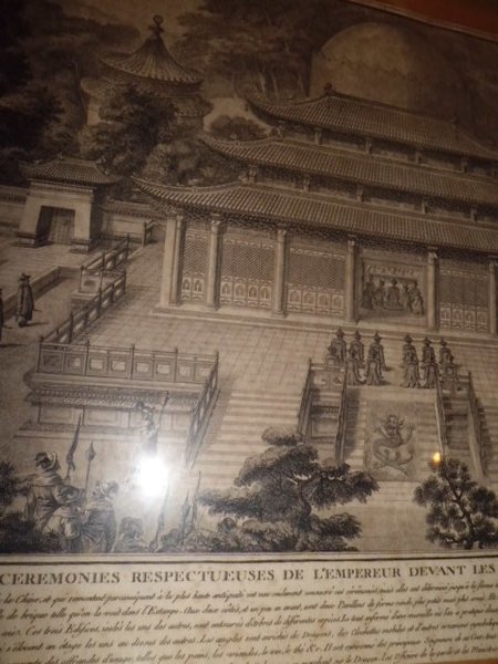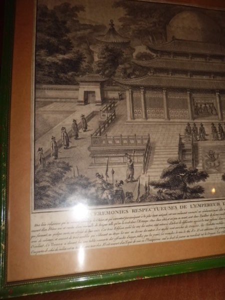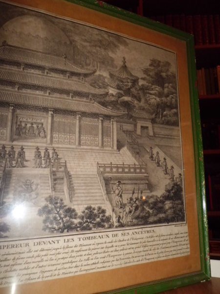 Ceremonies respectueuses de l' Empereur devant les Tombeaux de ses Ancètres. Des loic religeuses qui ne varient jamais a la Chine, et qui remontent par conséquent à la plus haute antiquité ont non seulement consacré ces cérémonies , mais elles ont déterminé jusqui à la forme des Monumens où repose la cendre des Ancetres de l' Empereur. Bella incisione originale di Isidore, Stanislas Helman. Paris, 1788. Misure: Xilografia mm. 400x285; con cornice 460x285 mm.